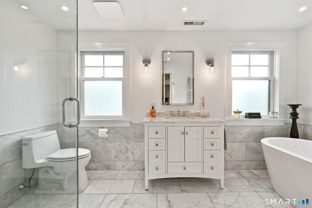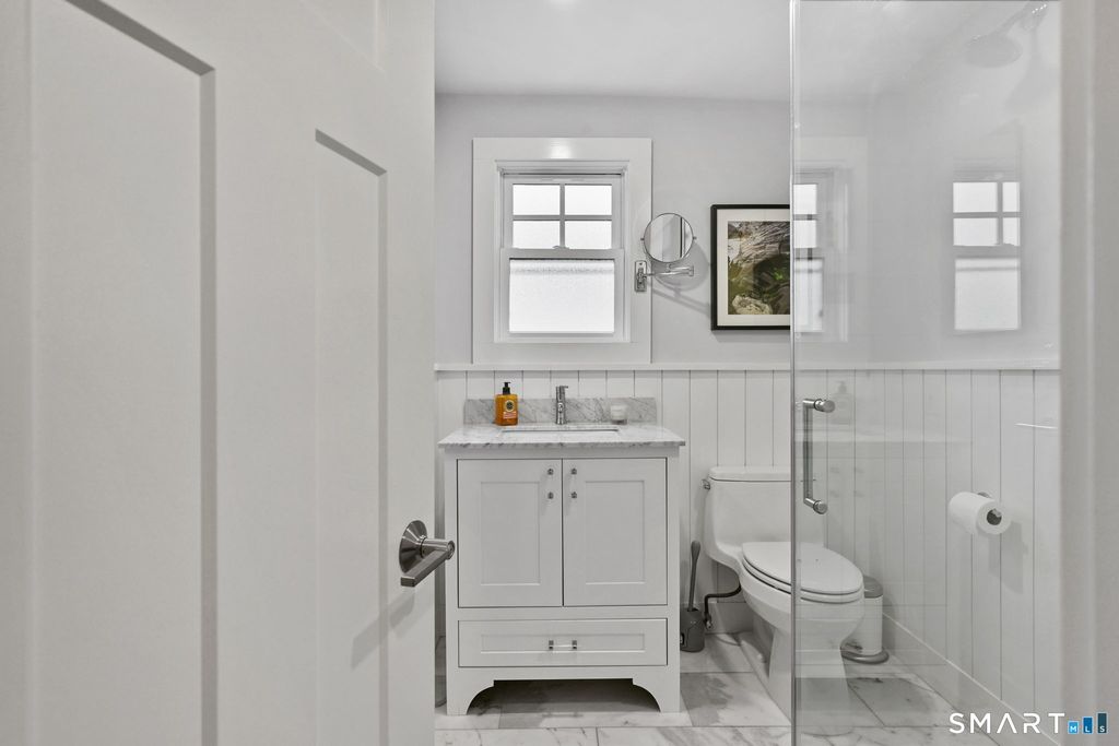 Don't miss this charming, completely renovated home quietly tucked away, yet exceptionally located in the heart of Cos Cob. A beautiful covered front porch leads to the inviting foyer with interior windows, open plan living room, dining area, and gorgeous kitchen featuring a huge island and French door access to deck and backyard. Main level bedroom with barn door and en-suite bath is also the perfect spot for an office. Serene primary suite offers built-ins, spa bath with radiant floors, towel warmer, and soaking tub. Two additional bedrooms, a full bath, and a great laundry room complete the second floor. The lower level was completed in 2025 and you can customize it to fit your needs; using the large space as a playroom, gym, or family room. Also has outdoor access to the fenced-in backyard. Home was fully gutted in 2018 with new roof, siding, electrical, windows and sprinkler system; driveway and Trex deck were redone in the last few years as well. Close to Cos Cob Village, Cos Cob and Loughlin Parks, and enjoy being just minutes away from Cos Cob school, restaurants, and the train. Total sq. footage including finished basement is about 2,260.