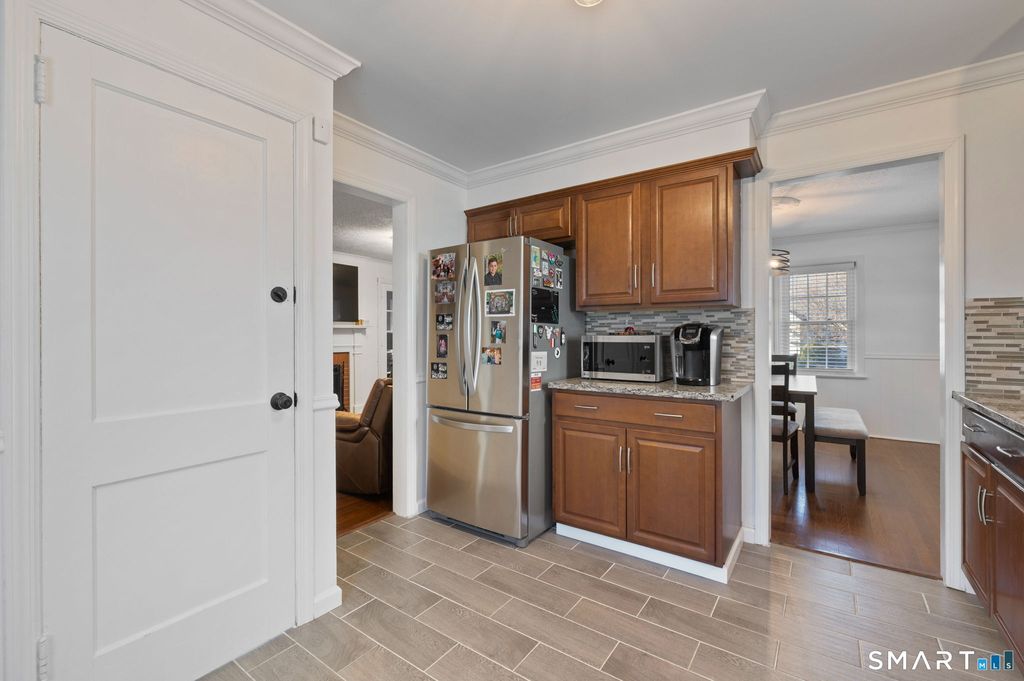 Welcome to this updated Colonial ideally located just a short walk to the water, train station, restaurants, and shopping. This home is the perfect blend of coastal living with easy commuter access to the local highways. The main level offers a bright, open flow with a welcoming open concept living room featuring a fireplace and hardwood floors, seamlessly connecting to the dining room and updated eat-in kitchen. The kitchen features granite countertops, stainless steel appliances, and new tile plank flooring, making it both functional and stylish. Also on the main level is a versatile first-floor bedroom with vaulted ceilings and durable vinyl flooring. Upstairs, you'll find the full bathroom, a comfortable primary bedroom, and a third bedroom, all with newer windows and fresh, neutral paint throughout. The lower level includes a partially finished space with new vinyl flooring, ideal for a recreation room, additional living area, or optional guest room, along with a laundry area and convenient half bathroom. Outside, enjoy a private fenced-in yard, a large deck for entertaining, and a one-car detached garage. With updated windows, newer paint, and thoughtful upgrades throughout, this home is move-in ready and well-positioned for both convenience and lifestyle. Schedule your showing today!