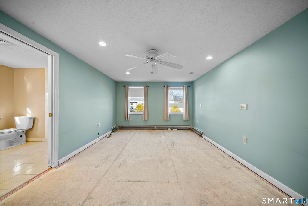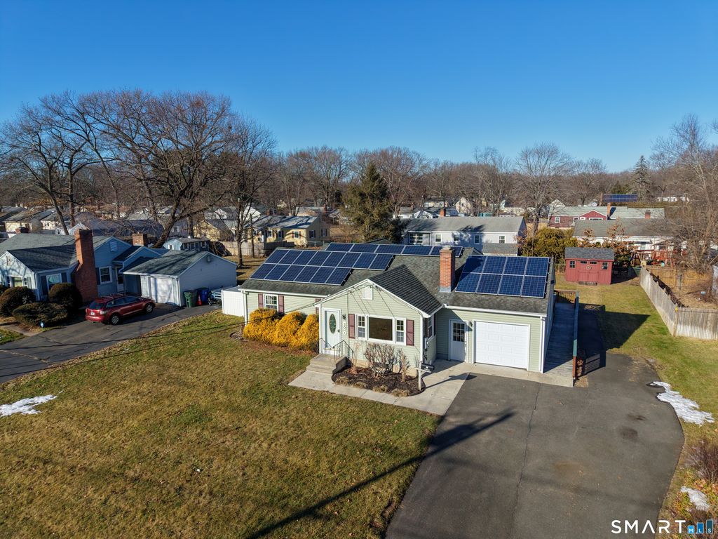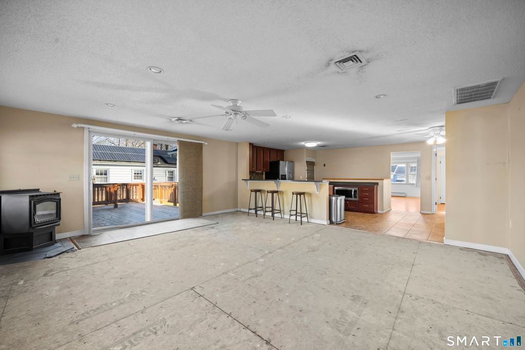 Incredible opportunity to make this expanded 1870sqft Ranch your own. A custom addition opens the kitchen to a spacious family room featuring a pellet stove and a fully handicap-accessible primary suite with an impressive 8x8 walk-in/roll-in tiled shower. The galley kitchen offers cherry cabinetry, granite countertops, and a breakfast bar, all open to the family room, with a dining area just off the kitchen. The main level includes three additional bedrooms, one currently configured as a laundry room (with additional hookups available in the basement). The living room features hardwood floors and a fireplace. Enjoy outdoor living on the large rear deck, with ramp access around the garage to the driveway. Nice shed in the backyard and there is an inground sprinkler system that was fed by a previous well. Oil heat with a young boiler and sidearm hot water, central air, and a partially finished basement with an additional full bathroom. Flooring and carpet have been removed in the family room and primary bedroom, providing a clean slate for updates. Bring your vision and add value-an excellent opportunity for instant equity and a fantastic place to call home. Property strictly sold As-Is. Leased solar with great terms also has a buy out option. Lease amount for '26 is $114/month with an average eversource bill of @$9/month