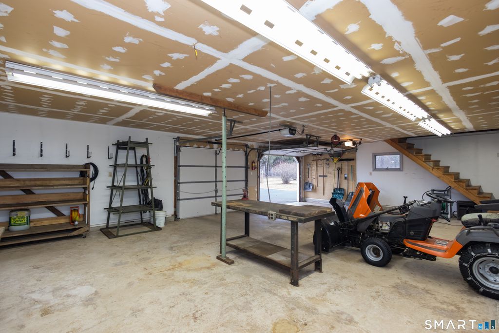 Charming farmhouse set on 2.2 acres of level land, ready for gardens, summer picnics, morning coffee on the deck overlooking the beautiful yard. The house offers a flexible and well-designed floor plan. The first floor features a welcoming mudroom with laundry, a full bathroom, and a kitchen that opens to the dining room. French doors lead from the dining area into a spacious family room, which could easily serve as a first-floor primary bedroom with convenient access to the main-level full bath. On the opposite side of the dining room is a generously sized living room, perfect for entertaining or everyday living. The second floor offers three comfortable bedrooms and a full bathroom. Hardwood floors run throughout much of the home, complemented by tile bathrooms and hallway. The kitchen features durable vinyl flooring. Additional highlights include Thermopane windows. The basement provides excellent utility and storage, featuring a large workshop, a finished room, a mechanical room, ample storage space, and two bulkheads. Outside, the property boasts an oversized two-car garage with a walk-up loft, offering great potential for storage or future use. Please note, the furnace in the garage is not currently connected, as the propane tank has been removed. A storage shed adds additional convenience. Goats and chickens are permissible (check with zoning for details) While the home has been well maintained, it is part of an estate and is being sold as is
