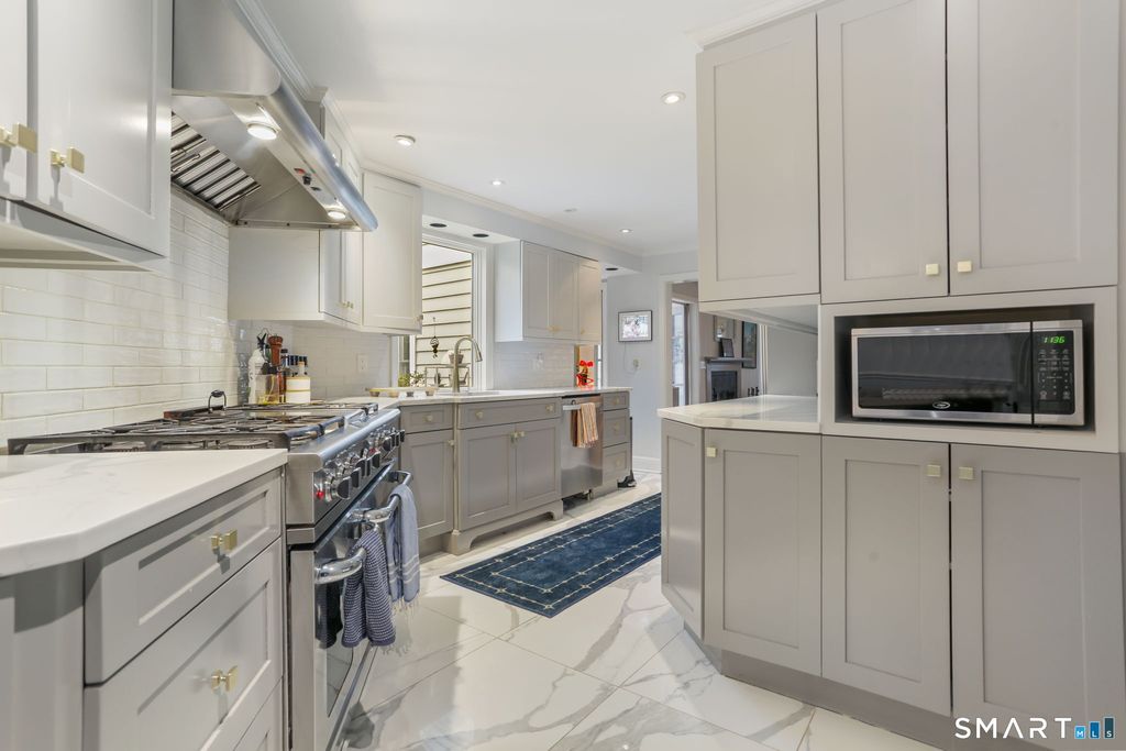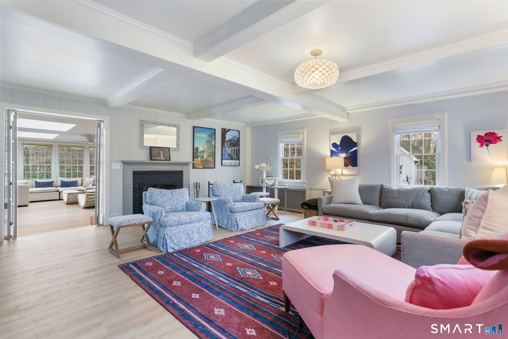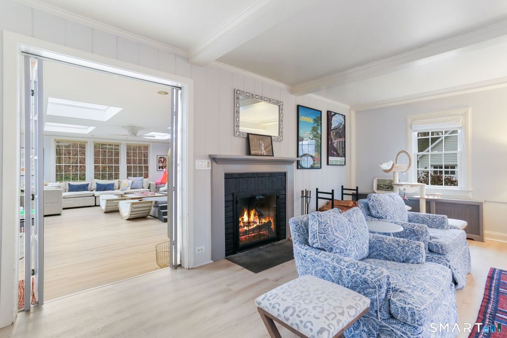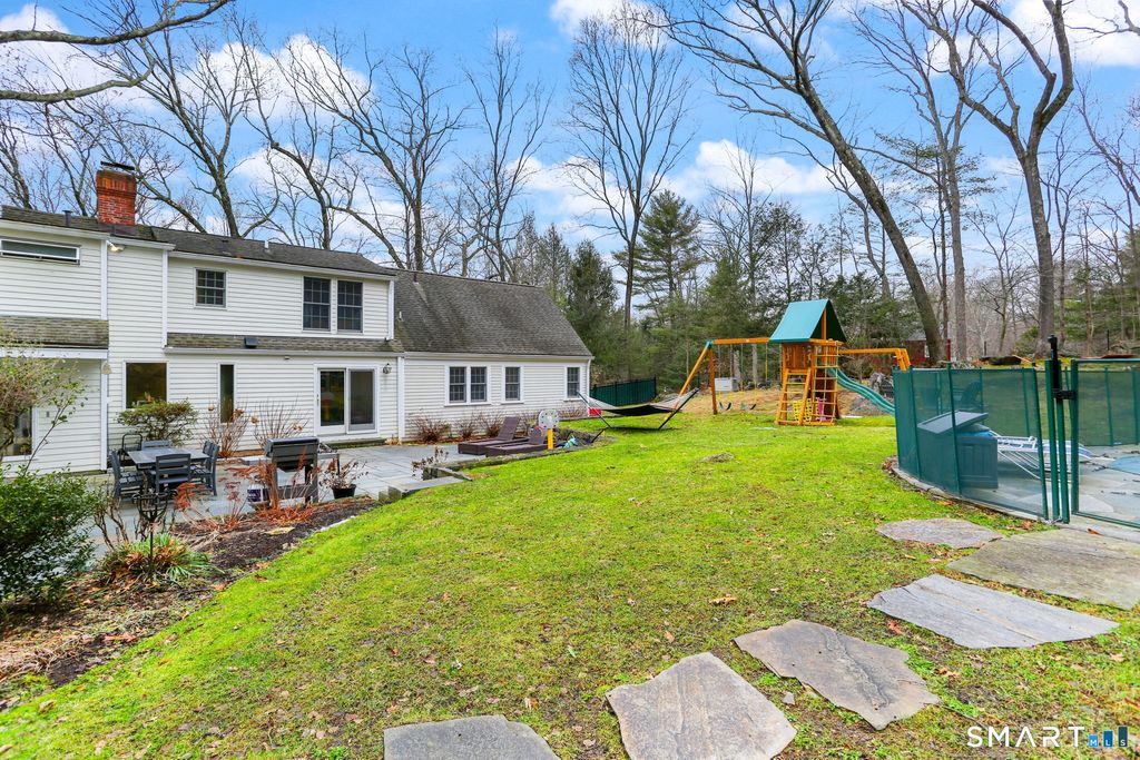 Beautifully updated 4-bedroom home with 4 full baths, set on a private, park-like acre in one of North Stamford's most convenient neighborhoods. The thoughtfully designed layout features a gracious formal living room with fireplace and an oversized dining room with fireplace-ideal for both elegant entertaining and everyday gatherings. The heart of the home is the expansive family room, filled with natural light from abundant windows and skylights, and offering seamless access to the patio, beautifully landscaped backyard, and pool. The updated eat-in kitchen is a chef's delight, featuring quartz countertops, a high-end stainless-steel gas range, and direct walkout access to the patio for easy indoor-outdoor living. A full bath conveniently located off this area is perfect for pool guests. The main level also boasts a luxurious primary suite complete with two generous walk-in closets and an oversized spa-like bathroom with soaking tub and steam shower. Upstairs, you'll find a spacious bedroom with en-suite bath, two additional well-sized bedrooms, and finished storage space. Outside, the private backyard retreat shines with a heated, saltwater in-ground gunite pool and mature landscaping that creates a serene escape. Additional highlights include a detached two-car garage and a full-house generator.