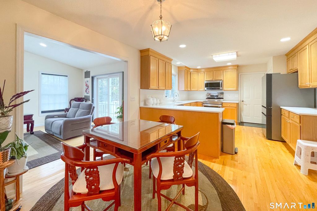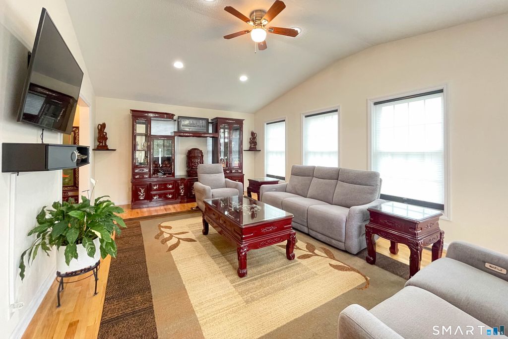 Spacious and sun-filled colonial featuring a lower-level walkout in-law! Bright, open living spaces, hardwood floors, natural-gas heating and fully fenced yard! The formal living room features a cozy gas fireplace, and leads to the dining room and family room with cathedral ceiling and a bright row of windows with custom shades. The eat-in kitchen has new quartz counters and stainless steel appliances, and a laundry room/half bath complete the first floor. Upstairs you'll find the four bedrooms including a large primary suite with hardwood floors, remodeled full bath and walk-in closet; and an additional full bath. In the walkout lower level, you'll find the legal in-law with full kitchen and another full bath with shower. A slider opens to the concrete patio under the deck above. A fully fenced yard is perfect for pets! With popular Wallingford Electric, Natural Gas, and public utilities - this checks off your list! Welcome Home!