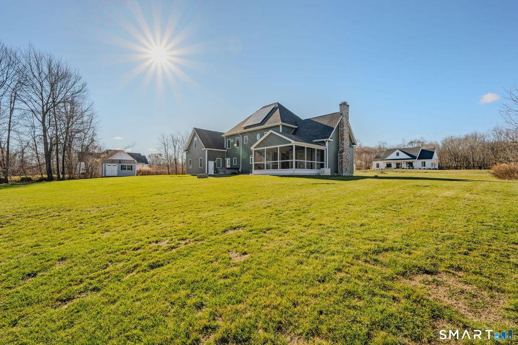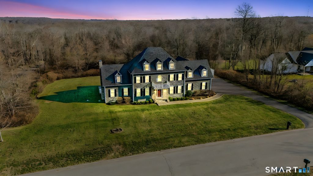 Nestled on a quiet cul-de-sac on nearly 2 acres, this meticulously maintained 2016-built home offers a thoughtful layout, quality finishes, and exceptional flexibility. While located in Salem, the property falls within the East Lyme public high school district. The main level features hardwood floors and a living room with a stone fireplace and soaring vaulted ceilings, creating an open, light-filled space ideal for everyday living or entertaining. The eat-in kitchen flows seamlessly into the dining area and is centered around a large island with electrical outlets, generous counter space, and room for multiple prep and seating options. An additional main-level flex room provides versatility for a sitting room, home office, or playroom, along with a half bath and a dedicated laundry room. Upstairs, the primary suite includes a walk-in closet and an en suite bathroom with a tiled shower and soaking tub. Additional bedrooms are well sized, including an expansive bedroom positioned above the three-car garage. The full basement offers partially finished space with direct access from the garage, providing additional flexibility for recreation, workspace, or storage. Outdoor living is enhanced by a screened-in porch with ceiling fan, a concrete patio with hot tub, and a well-maintained yard complemented by a storage shed. Fresh paint, blinds, brand new carpeting, central air, solar panels, and pride of ownership throughout make this home truly move-in ready