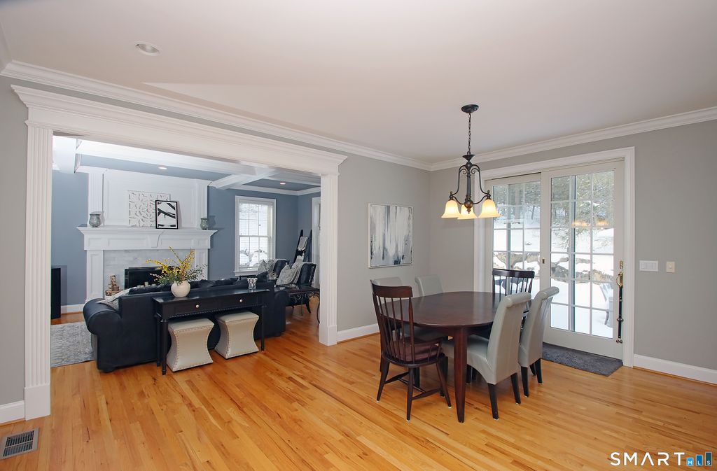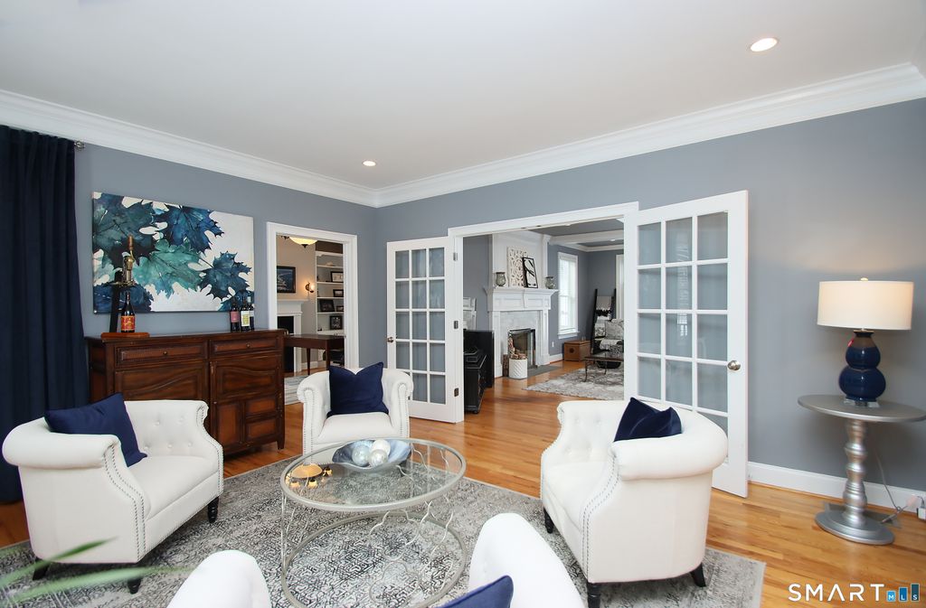 An impeccable ten-room Colonial filled with architectural detail and timeless charm. Sunlight streams through abundant windows, highlighting refined moldings, beautiful finishes, and graciously scaled rooms. The flowing layout blends classic elegance with modern comfort, beginning with an expansive living room that opens to a private library featuring a gas fireplace, custom bookcases, a tray ceiling, and access to a lovely open porch. The inviting family room offers a striking fireplace, coffered ceilings, French doors to a secluded patio, and an adjacent powder room. It connects seamlessly to the central island kitchen with access to patio and appointed with a breakfast bar, double ovens, Sub-Zero refrigerator, Viking six-burner cooktop, quartz counters, a mudroom entrance, and an additional half bath. A formal dining room is ready for great entertainment! The second floor includes four generous bedrooms, three full baths, and a spacious laundry room. The serene primary suite features a cozy sitting area, a large walk-in closet, and an updated spa-like bath. A special third-floor retreat provides flexible space ideal for a playroom, guest room, or studio. The lower level offers a finished workout area, abundant storage, updated a/c units and exceptionally high ceilings which is an excellent opportunity for future expansion. Meticulously maintained and beautifully detailed, this exceptional home enjoys a premier location and a rare blend of comfort, and character.