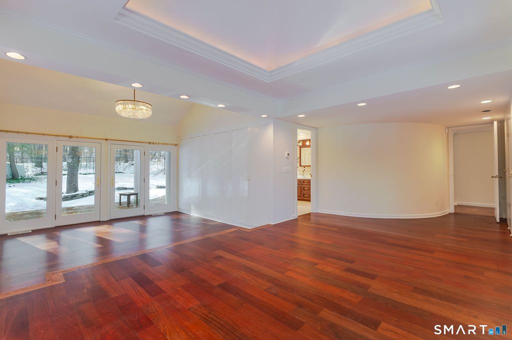 Stunning custom contemporary ranch tucked at the end of a quiet cul-de-sac! This exceptional home offers a true resort style lifestyle. Located on a 2.03 acre professionally landscaped property which is enhanced by a heated gunite pool w/spa, a tennis court and serene views. The lot backs up to over 21 acres of protected land trust property which offers easy access to the town's extensive walking trails. Over the years, the home has been thoughtfully improved and meticulously maintained. Inside, the open floor plan centers around a spectacular light filled great room featuring vaulted ceilings, a striking stone fireplace, gleaming cherry flooring, and a dramatic circular staircase leading to the loft. The custom kitchen impresses with newer tile flooring, granite countertops, high-end stainless steel appliances including a gas Jenn Air cooktop, and a spacious pantry room complete with wet bar, wine refrigerator & abundant cabinetry. The living room elevates entertainment with a large retractable theater/TV screen ideal for movie nights! A stunning hallway leads to the bedroom wing, showcasing a domed ceiling w/custom lighting, extensive millwork, and beautiful built-in's. The primary suite is a retreat of its own, offering cherry flooring, a tray ceiling, retractable blinds & a generous sized sitting/dressing room w/extensive closet space. Other features include a finished rec room/gym & walk-in cedar closet. Close to Yale & downtown New Haven. Award winning school district!!