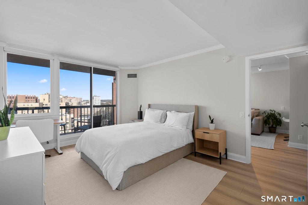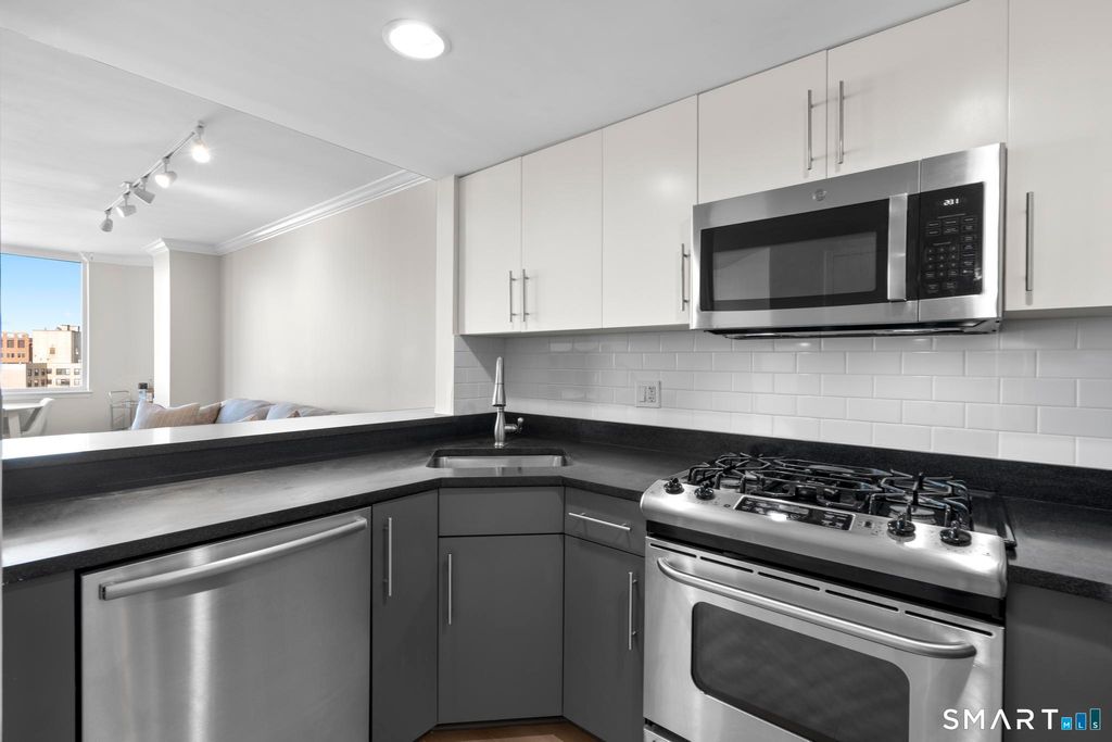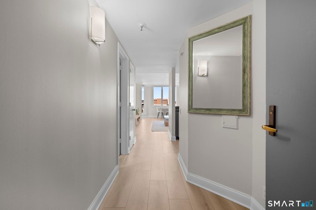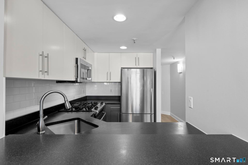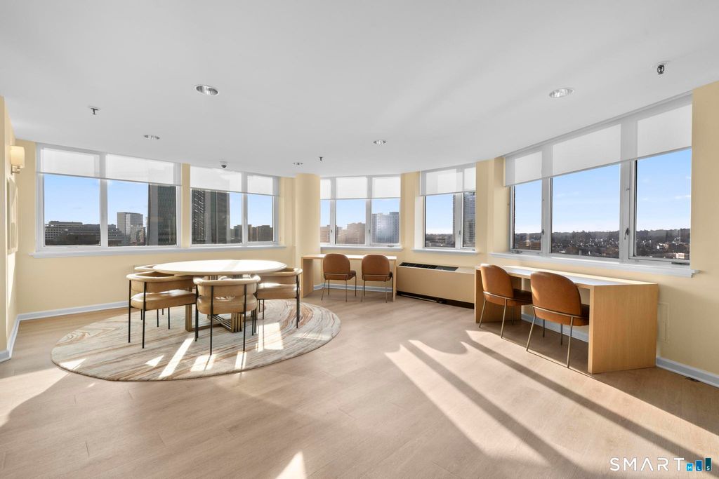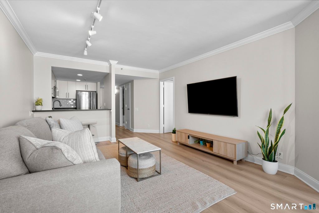 Experience elevated living in this rare one-bedroom penthouse in the heart of downtown Stamford. Thoughtfully refreshed, the residence has been freshly painted and updated with new crown molding and wide plank flooring, creating a polished, timeless aesthetic throughout. The open living area is designed for both comfort and entertaining, extending seamlessly to an oversized private balcony with expansive city views. The kitchen features stainless steel appliances and a functional layout that integrates effortlessly with the living space. The bedroom is generously sized with ample closet storage and in-unit laundry adds everyday convenience. Residents enjoy a curated collection of recently refreshed amenities, including a modern lounge and work space, updated fitness center, on-site dog park, heated indoor pool and a rooftop terrace offering a private outdoor escape above the city. The building also offers 24/7 concierge service, a reserved garage parking space and a dedicated bike storage area, enhancing both convenience and lifestyle. Located just steps from Stamford's dining, shopping, and nightlife and convenient access to I-95, this penthouse delivers a refined urban lifestyle defined by design, comfort, and location.