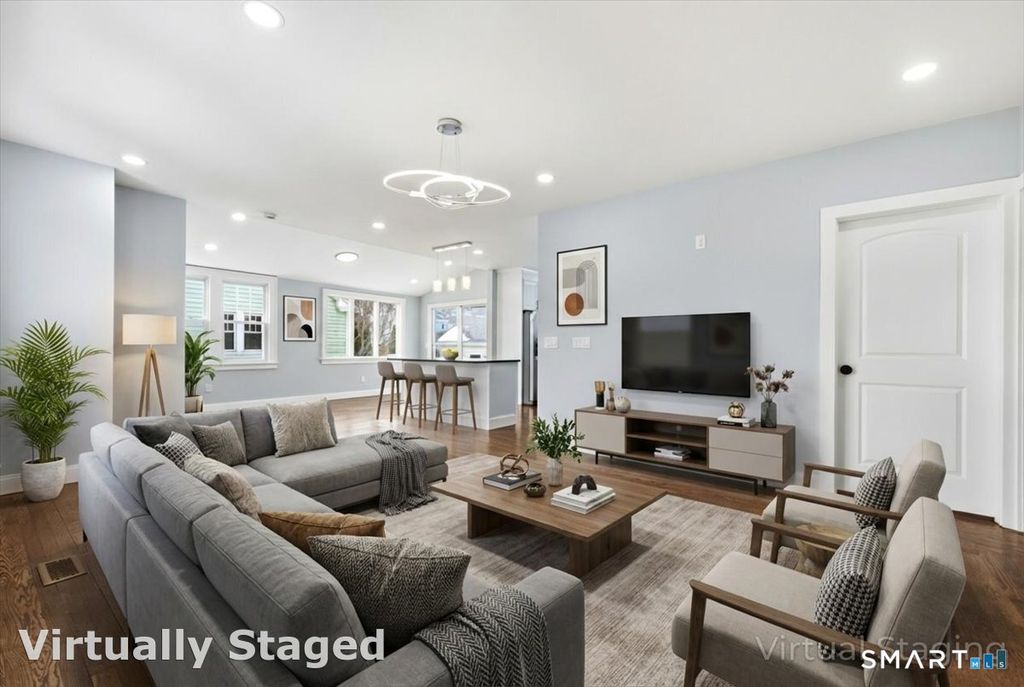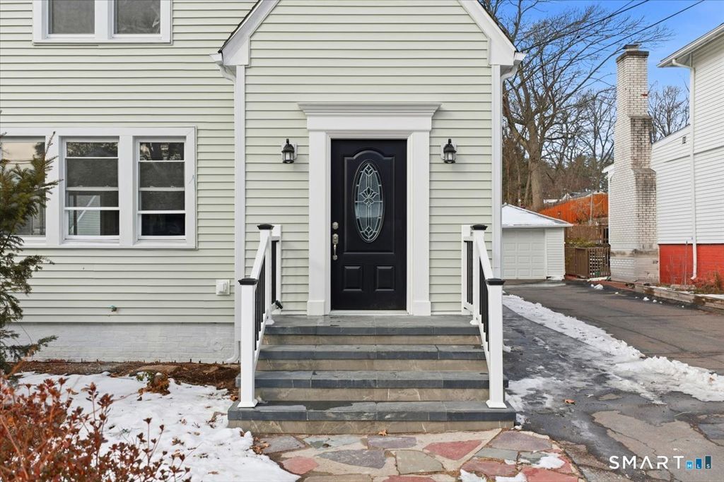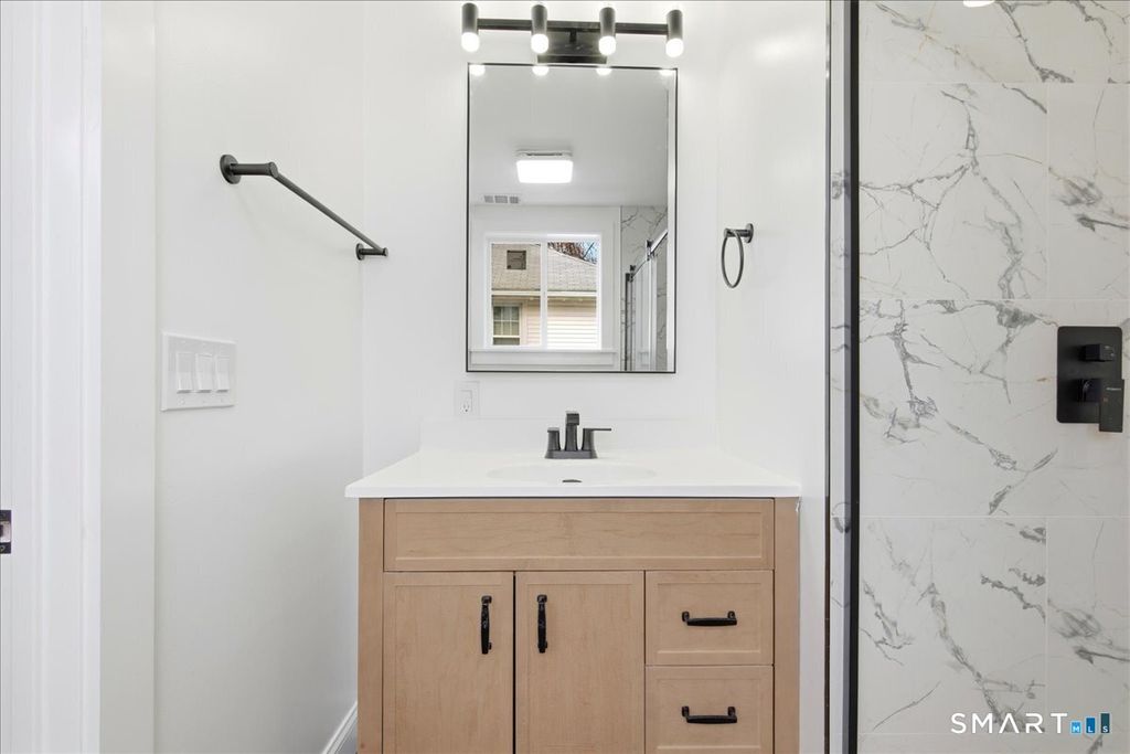 Stunning fully renovated home in the heart of Hamden offering modern luxury, open-concept living, and exceptional craftsmanship throughout. This move-in ready property features a beautifully designed chef's kitchen with white shaker cabinetry, quartz countertops, oversized center island, stainless steel appliances, stylish tile backsplash, and contemporary pendant lighting-perfect for entertaining. Enjoy sun-filled living and dining spaces with refinished hardwood floors, recessed lighting, and a seamless open floor plan. The home offers spacious bedrooms with ample closet space, updated windows, and a fresh neutral color palette. The fully remodeled bathroom showcases designer marble-style tile, a glass-enclosed tub/shower with rainfall shower system, matte black fixtures, custom vanity, and modern finishes for a spa-like feel. Additional upgrades include updated electrical and lighting, modern trim, and thoughtful details throughout. Central Air! Exterior offers great curb appeal in a desirable residential neighborhood close to shopping, restaurants, schools, parks, Yale, and major commuter routes.