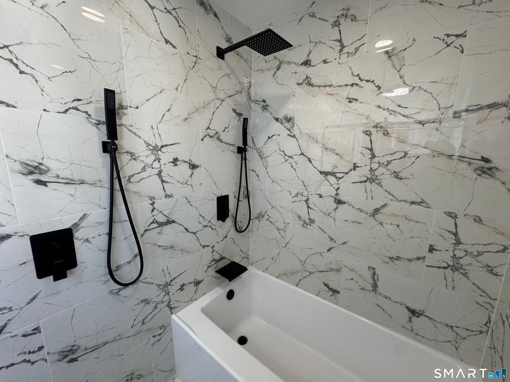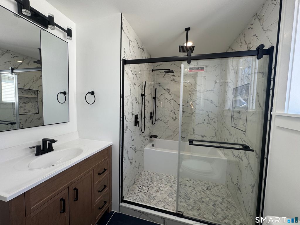 Stunning fully renovated home in the heart of Hamden offering modern luxury, open-concept living, and exceptional craftsmanship throughout. This move-in ready property features a beautifully designed chef's kitchen with white shaker cabinetry, quartz countertops, oversized center island, stainless steel appliances, stylish tile backsplash, and contemporary pendant lighting-perfect for entertaining. Enjoy sun-filled living and dining spaces with refinished hardwood floors, recessed lighting, and a seamless open floor plan. The home offers spacious bedrooms with ample closet space, updated windows, and a fresh neutral color palette. The fully remodeled bathroom showcases designer marble-style tile, a glass-enclosed tub/shower with rainfall shower system, matte black fixtures, custom vanity, and modern finishes for a spa-like feel. Additional upgrades include updated electrical and lighting, modern trim, and thoughtful details throughout. Exterior offers great curb appeal in a desirable residential neighborhood close to shopping, restaurants, schools, parks, Yale, and major commuter routes.