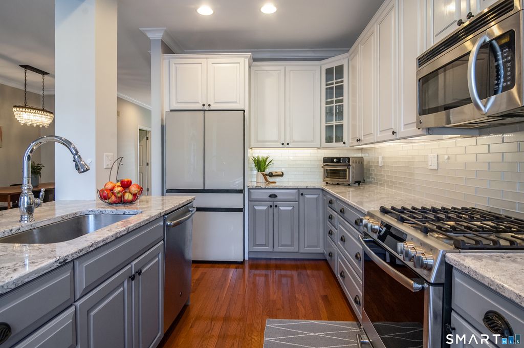 A thoughtful fabulous remodel opened the Kitchen directly to the generous Great Room creating a modern, airy vibe unique to this stunning 3 bedroom Townhome. Ideally set in the highly sought after and beautifully maintained Quaker Green community. Stylish upgrades throughout beginning in the Kitchen w/plentiful cabinetry, striking quartz counters, island w/breakfast bar, newer chic Bespoke Samsung french dr style refrigerator & pretty dining area. Unwind or entertain in the inviting Great Room w/adjoining Dining Room & access to a lovely private patio w/level green space. Gleaming hardwood floor upgrade throughout main & second level. Upstairs the primary suite is relaxing retreat beautifully appointed w/attractive updated bath w/glass tile, lg walk-in closet, & enhanced by cathedral ceiling that lends an open, expansive feel. Two additional well sized bedrooms share the second level w/hall bath & convenient laundry. A generous 3rd level carpeted loft offers options for game/media rm, study, and/or work out space! Future potential in the unfinished LL w/daylight window & already plumbed for bath. Attached garage. Newer furnace(2024) and hot water heater(2023).Smart Nest thermostats. Meticulously maintained and ready for you to move right in and enjoy Quaker Green's fabulous location- easy access to Trout Brook Trail,just a stroll to local shops & restaurants and enjoy the many amenities including heated outdoor pool, fitness center, social & billiard rooms, & kids playground!