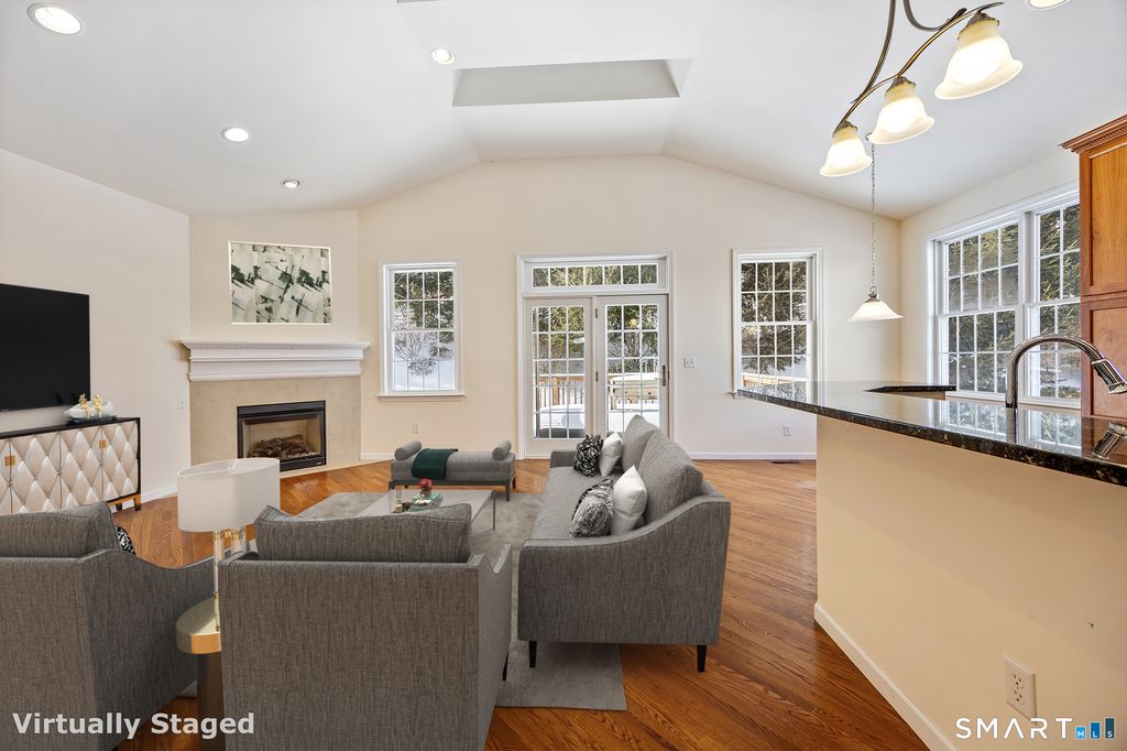 An open floor plan enhances this attractive ranch-style home, offering the ease of one-level living with hardwood floors and central air. The welcoming foyer opens to an elegant dining room. A spacious great room with vaulted ceilings and a gas fireplace flows seamlessly into the eat-in kitchen. The kitchen features beautiful granite countertops, wood cabinetry, a newer refrigerator, and a newer cooktop stove. The primary suite impresses with double doors, a walk-in closet, and a luxurious bath with a large double-sink vanity. The bedroom provides a private retreat with lighted tray ceiling. A second bedroom with its own ensuite bath makes an ideal guest suite. Additional highlights include a powder room, laundry room, 2 car garage, and a full unfinished basement offering abundant storage. This 55+ condo complex is ideally located in a highly desirable area, conveniently close to Route 8 and surrounding towns.