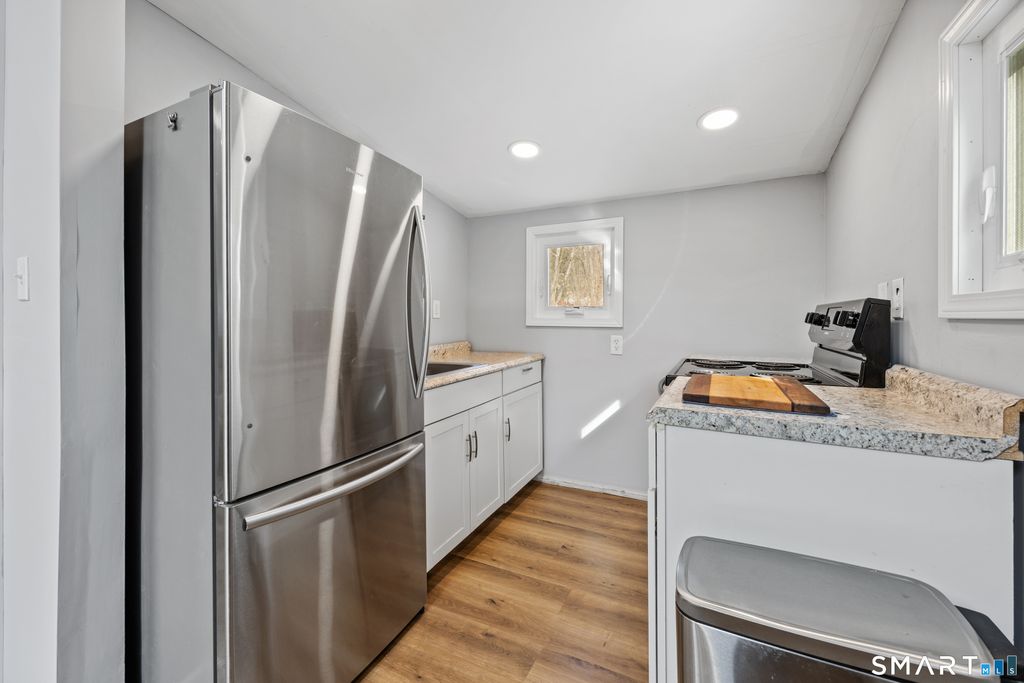 Welcome to this charming 3 bedroom, 2 bath contemporary ranch located on Kanungum Trail in Shelton with beautiful sunset views. Thoughtfully updated and full of warmth, this home offers a comfortable layout with tasteful finishes throughout. Step inside to find wood floors and recessed lighting that create a bright, welcoming feel. The living room is anchored by a cozy floor to ceiling stone fireplace with wood stove, perfect for relaxing evenings while keeping this home nice and warm. The kitchen features stainless steel appliances and flows seamlessly into the main living spaces ideal for everyday living and entertaining. Lower level features the third bedroom with beautiful barn door, full bathroom and laundry area. Recent improvements include a new asphalt driveway, new staircase and modern style banister, updated landscaping with additional parking, a new oil tank, waterproofed crawl space, updated windows, fresh paint, new interior doors, updated mudroom entry and beautiful cedar accent details, adding both character and peace of mind. Build your dream garage! Approximately 20x30 garage block foundation is in place ready to be built. Set in a desirable Shelton location right near Sikorsky Aircraft Headquarters, this inviting home blends comfort, style, and thoughtful updates ready for you to move in and make it your own.