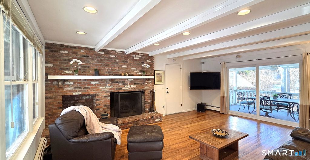 Welcome to a home where everyday living feels easy & every gathering feels special. This splendid Dutch Colonial situated on a quiet cul-de-sac lane in bucolic North Stamford offers the perfect blend of charm & comfort. The main level has a fabulous floorplan where formal living spaces flow into casual retreats. The expansive living room, featuring a wood-burning fireplace, opens to a spacious dining room made for celebratory dinners. Beautifully updated, the eat-in kitchen is a real pleaser with white cabinets, stainless steel appliances & quartz countertops. It leads to the enclosed three-season porch & multi-level deck-ideal for summer barbecues, morning coffee or dining under the stars. Just off the kitchen, the rustic-style family room with beamed ceilings, a brick fireplace & sliders to the porch creates a cozy retreat. Upstairs, the primary suite offers a peaceful escape with a walk-in closet, spacious bath with a large walk-in shower and a versatile sitting room that could serve as an office, fitness room, nursery or den. Two additional bedrooms include an oversized third bedroom that can easily be converted back to create a fourth. The retro-style hall bath has a tub/shower combination. The walkout lower-level with full-height ceilings has a 3rd fireplace and provides exceptional bonus space with endless possibilities. Beautifully set on a picturesque one-acre corner lot framed by mature trees. Other features include a two-car garage, circular driveway & central A/C.