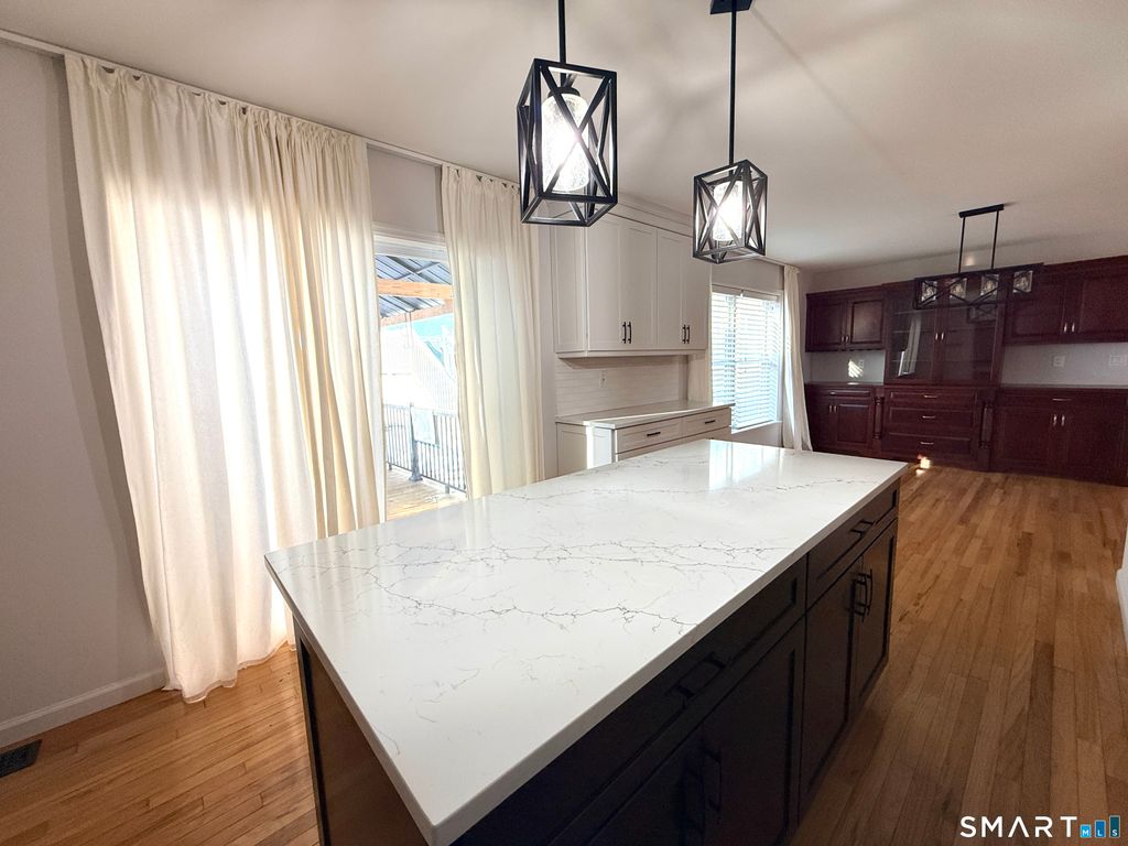 This well-maintained and thoughtfully improved four-bedroom, two full and one half bath raised ranch offers both comfort and functionality inside and out. The main level features hardwood floors throughout, with a sun-filled living room that flows seamlessly into the formal dining area-perfect for everyday living and entertaining alike. The kitchen has been tastefully updated and serves as the heart of the home, showcasing quartz countertops, a spacious center island with seating, and a dedicated coffee bar. The primary bedroom includes a large closet and convenient access to a full bathroom, while two additional bedrooms are generously sized with ample closet space and share the second full bath. The finished lower level provides flexible living space ideal for a home office, playroom, gym, or additional family room. Since the home last sold, numerous improvements have been completed, including expanded deck space, upgrades to the pool heater, filter, and pump, and a new heating and air conditioning system-adding both comfort and peace of mind. Step outside and enjoy a backyard designed for relaxation and entertaining, featuring an above-ground pool surrounded by generous decking, along with a second deck offering direct access from the kitchen. Ideally located close to shopping and dining, and just minutes from state forest and state park walking and hiking trails, this home offers the perfect balance of convenience and outdoor enjoyment.