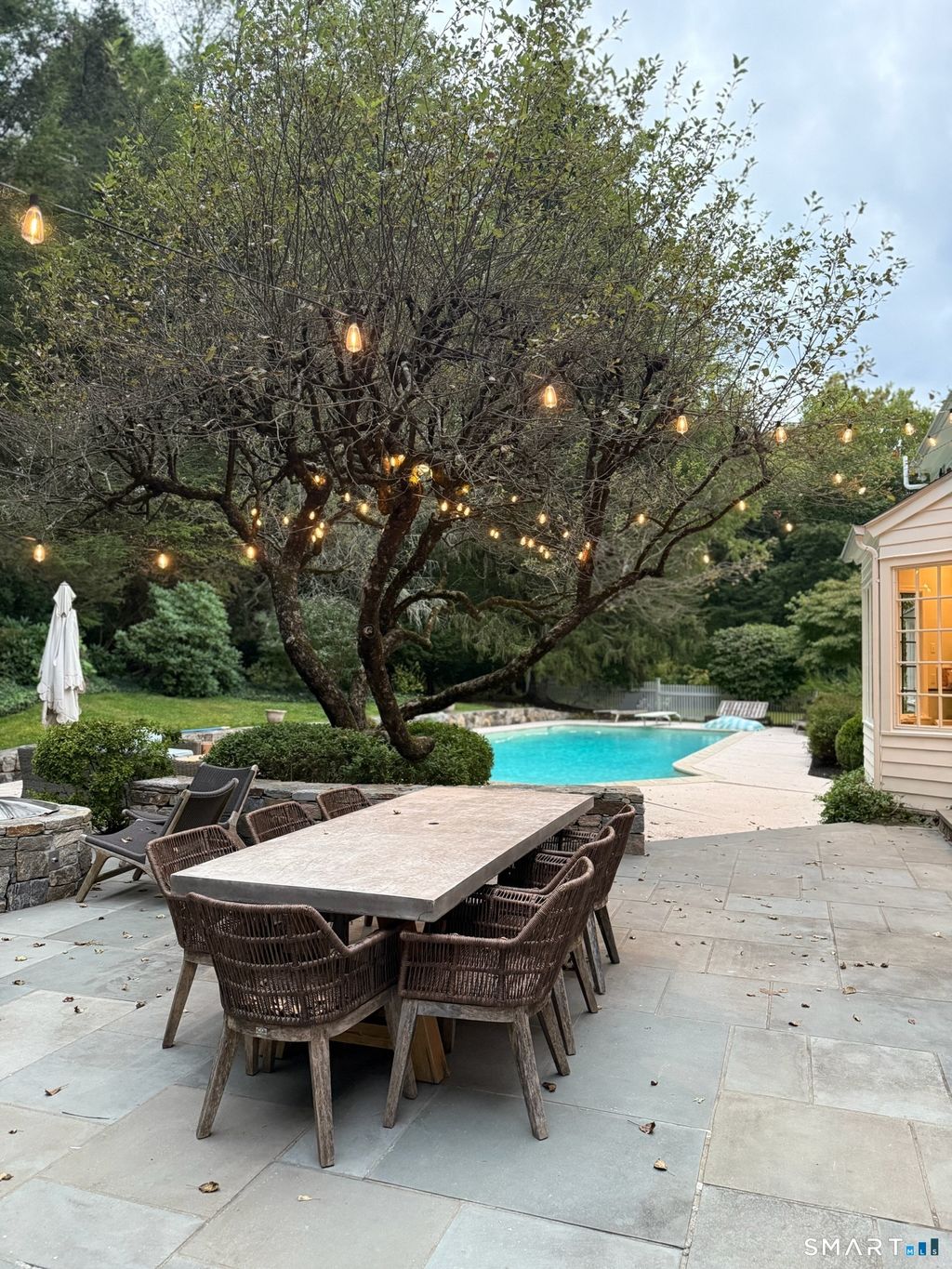 Settle in to the summer you've been waiting for. This beautifully furnished home lives like a private resort, where days begin poolside and evenings unfold on the expansive terrace with outdoor kitchen and fire pit, surrounded by lush, manicured grounds. Designed for effortless indoor-outdoor living, every space invites you to slow down, entertain easily, and enjoy the season. Inside, light-filled rooms offer comfort and flexibility with five bedrooms, a dedicated home office, four full baths, and two powder rooms. The oversized eat-in kitchen-complete with honed granite counters, high-end stainless appliances, and a wet bar-anchors the home and makes gathering feel natural and relaxed. Multiple living areas provide room to unwind, work remotely, or enjoy movie nights, while an upstairs playroom with projector, a private gym, and sauna elevate everyday living. Tesla charging station. Fabulous in-town location with easy NYC access. Summer at its very best! Arrive, exhale, and enjoy.