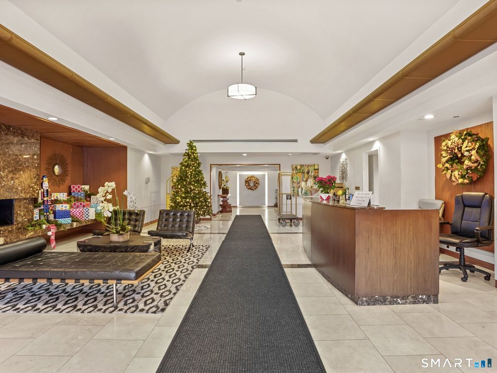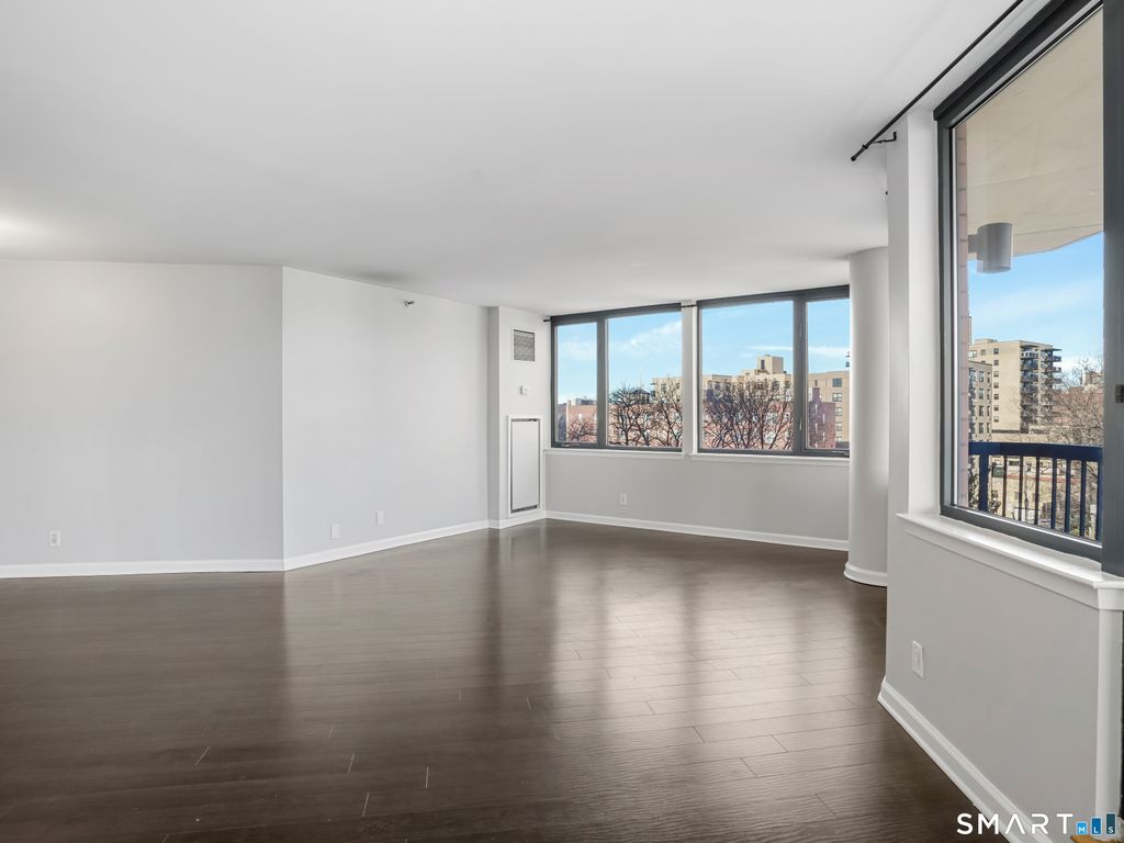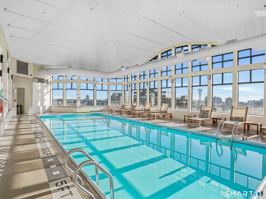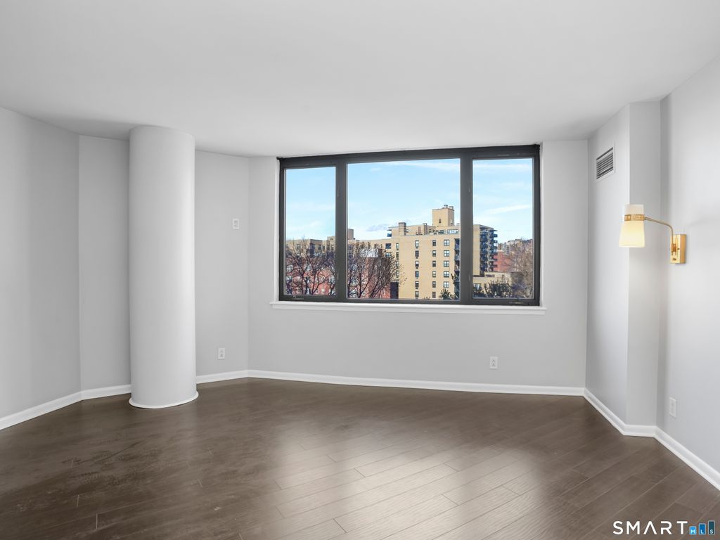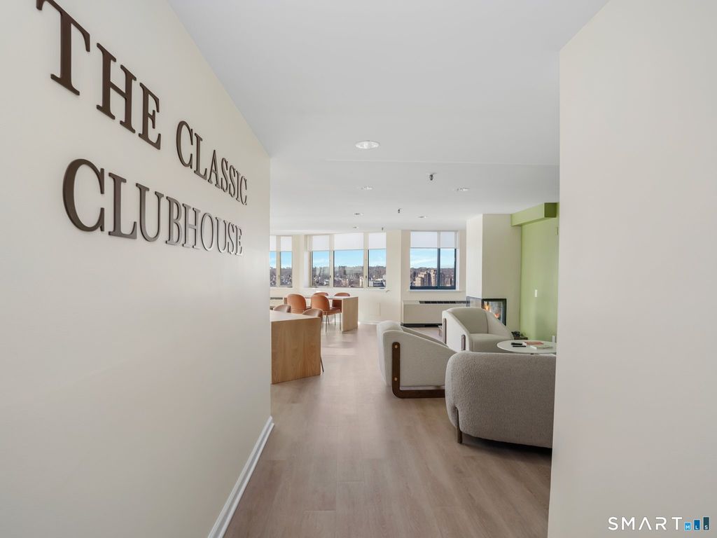 City lifestyle at its best! Located in the heart of downtown Stamford, just minutes to shopping, parks, beaches, popular restaurants and Metro North Train Station. The Classic offers a walkable city life with outstanding amenities that include 24/7 concierge, a glass enclosed rooftop pool overlooking the city, a "state of the art" fitness center and a newly renovated common area for entertaining and relaxing. In addition, there is a pet friendly green "park" off the 3rd floor, along with an area set up with outdoor grills for summer dining. This spacious 1 BR unit is the largest one bedroom floor plan in the building with two full bathrooms, and panoramic views of the city from the walls of windows. The open floor plan living area is perfect for a full sectional, a dining space, and a cozy corner for an office desk. Glass sliders lead to the private balcony, providing an additional outdoor space. The unit features all hardwood floors in a rich walnut color, stainless steel appliances and sleek black granite countertops in the kitchen, an updated ensuite bathroom/bedroom, and multiple closets with built-ins for storage. One deeded parking spot in the building garage is included. One hour from Stamford Metro North in to Grand Central.