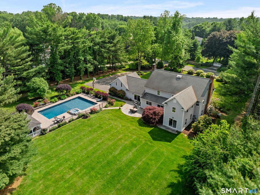 Step into the epitome of elegance & comfort at 158 Coventry Lane, a stunning Connecticut Colonial located in the prestigious Greenfield Hill area of Fairfield. Beautifully sited on a vibrant cul-de-sac, this turn-key home offers an unparalleled lifestyle in a serene, picturesque setting. Set on 2 acres of level grounds, this property is a true sanctuary w/impeccably landscape, stone walls, a bluestone patio & walkways, a heated saltwater pool & spa, enclosed vegetable garden & pool house. It's the perfect retreat for both relaxation & year-round entertainment. Inside, sophistication meets functionality. A dramatic triple-height foyer w/herringbone floors greets you, setting the tone for the 4,244 sq feet of updated living spaces. The layout is designed for both large gatherings & everyday comfort. The family rm, with its vaulted ceiling & floor-to-ceiling fieldstone fireplace, flows seamlessly into a private den/media room complete with a wet bar. The elegant living rm, featuring a beautiful gas fireplace, opens to a versatile office, playroom or guest suite w/an adjacent full bath. The heart of the home is a sleek modern kitchen, boasting a 9-foot quartz island, wine fridge & panoramic views of the backyard oasis. Upstairs, the primary suite is a private retreat w/a dramatic fireplace & spa-like bath. 3/4 addt'l bedrooms, and a private home office ensure space for every need. Only 8 mins to downtown Fairfield train station, shopping and dining.