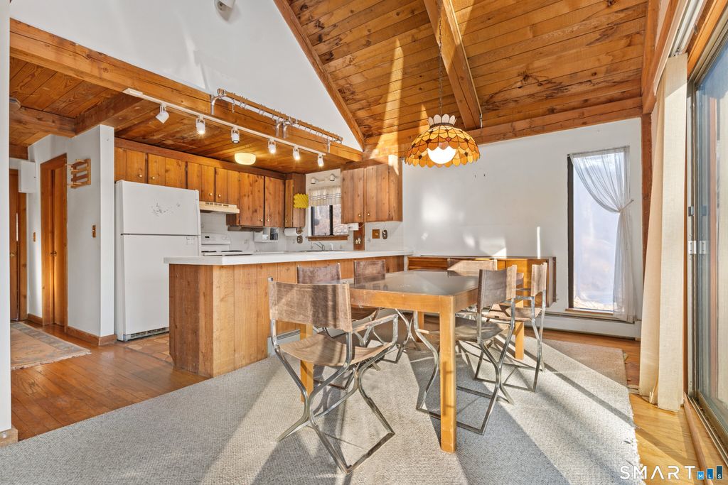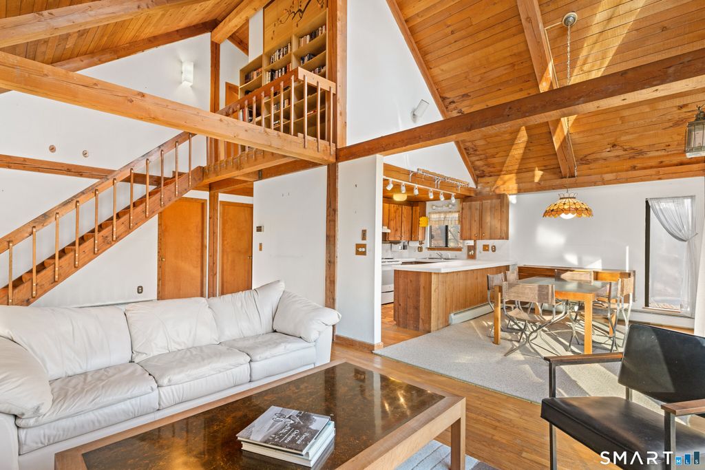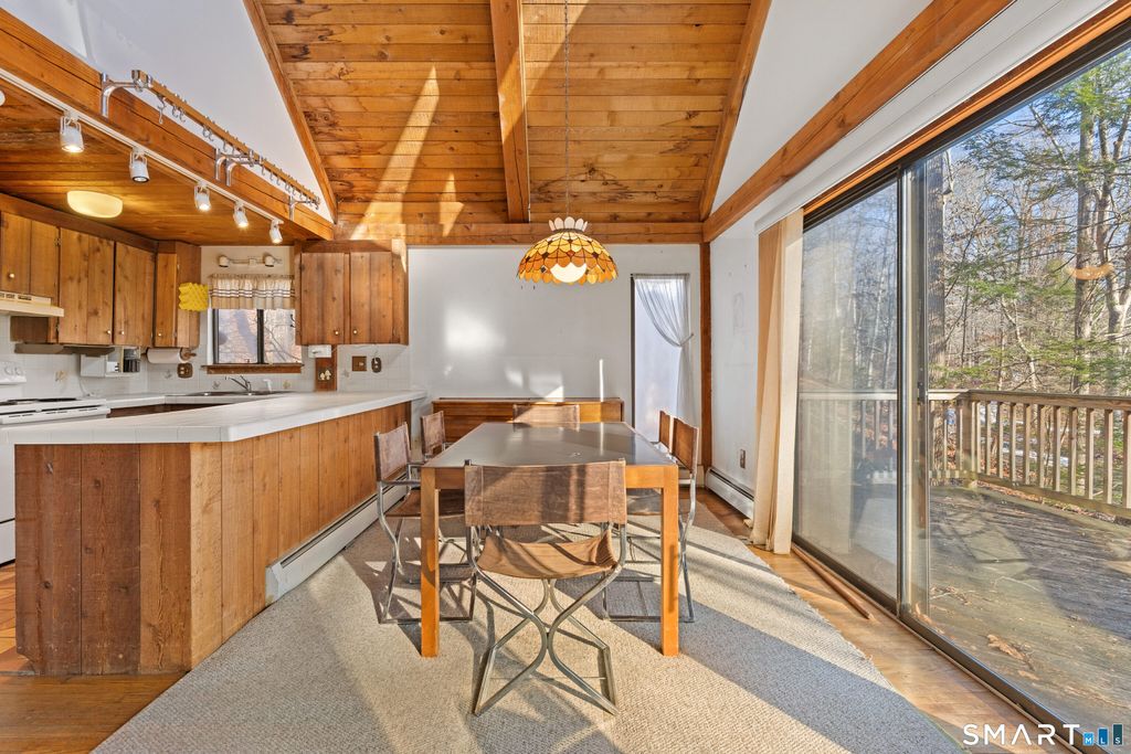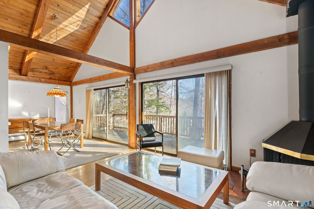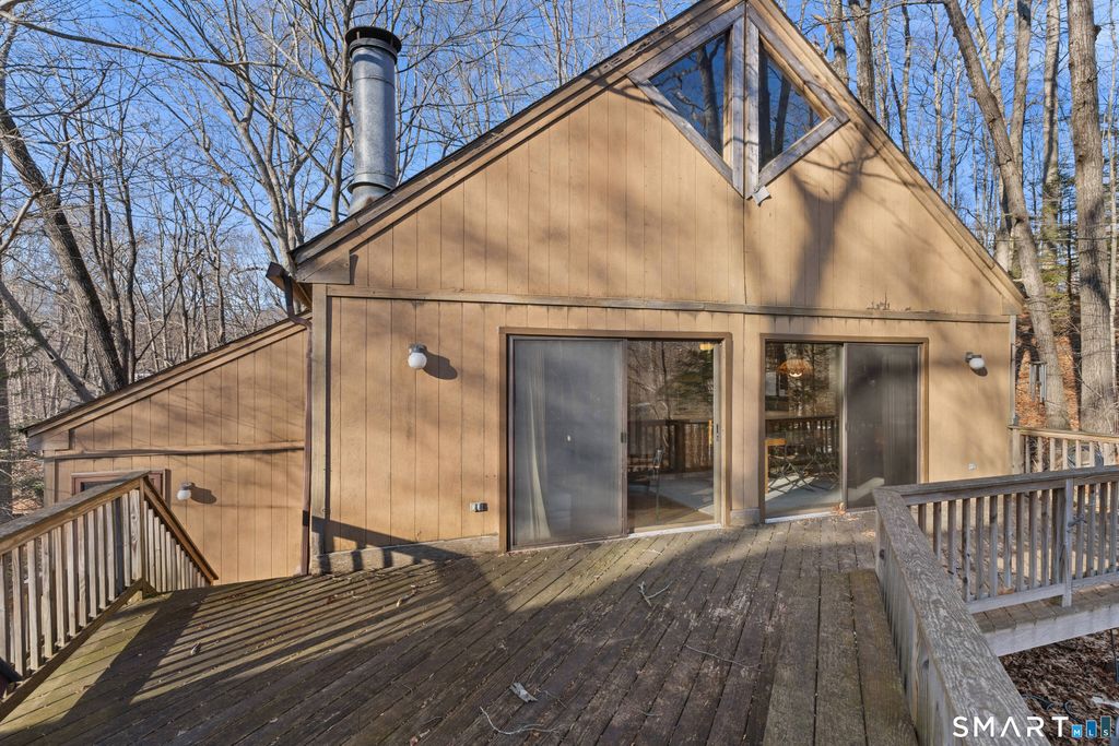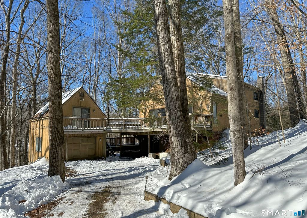 Escape the everyday and feel like you're on vacation all year long in this stunning contemporary Cape. Tucked away in a serene, wooded setting, this home perfectly blends rustic warmth with modern open-concept design. Step through the foyer and head upstairs to a breathtaking main living area. The cathedral ceilings and exposed wood beams immediately set a relaxed, "vacation house" vibe. The open layout seamlessly connects the living room, dining area, and kitchen, making it an ideal space for entertaining. At the center of it all is a cozy wood-burning fireplace, perfect for chilly evenings, while large sliding glass doors open directly onto an expansive deck for seamless indoor-outdoor living. Ascend the open staircase from the living room to discover a private, oversized primary suite, complete with its own full bath and generous closet space. The walk-out lower level offers even more versatility with a large family room, a dedicated home office, a third full bath, and ample storage solutions. In addition to the interior rooms, this property features a unique heated extra office space located across the deck, situated privately above the one-car garage. It's the perfect sanctuary for remote work, a creative studio, or a quiet hobby room. Bring your imagination and make this charming, character-filled home your own. Seller is requesting highest and best offers by 12:00pm Tuesday 2/3/26. Please include prove of funds or mortgage pre approval with all offers.