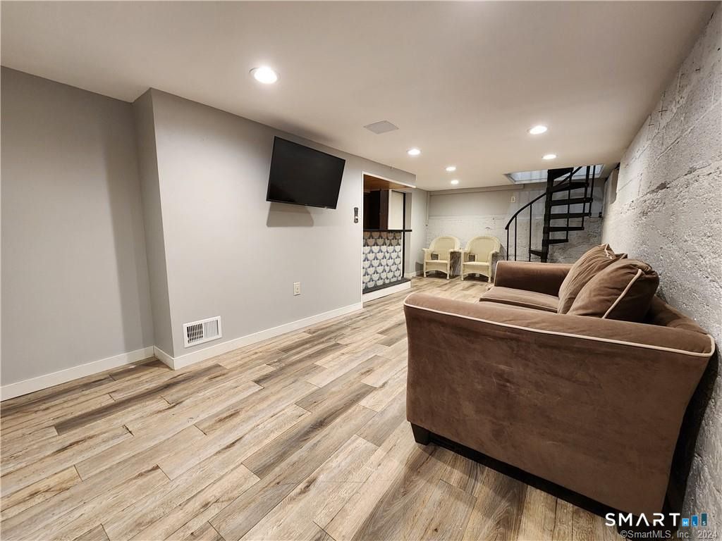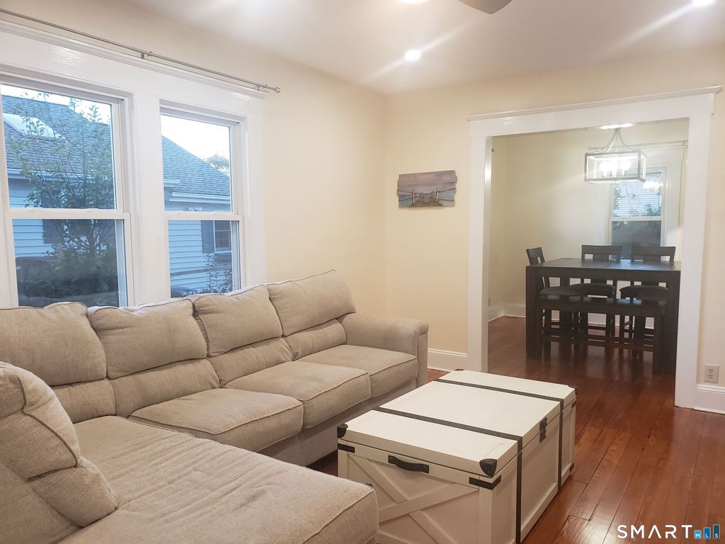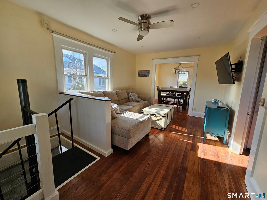 Charming ranch-style home ideally located just a short walk from Walnut Beach and the Long Island Sound. This well-maintained residence offers hardwood floors, newer windows, and a bright, inviting living room with a ceiling fan and spiral staircase leading to the finished lower level. The vintage kitchen features ample cabinetry, generous counter space, and convenient access to laundry just outside the door. The home includes a comfortable bedroom and a full bathroom with natural light. The newly finished lower level expands the living space with engineered flooring, recessed lighting, a flexible layout, and a full walkout to the fenced backyard-ideal for additional living, recreational, or workspace use. Outdoor highlights include a covered front porch, paved driveway leading to a one-car garage, and a private, fenced yard. Conveniently situated near the train station, I-95, local shops, dining, and shoreline amenities.