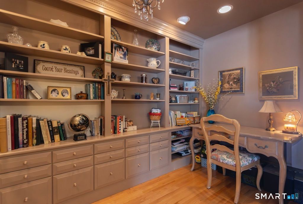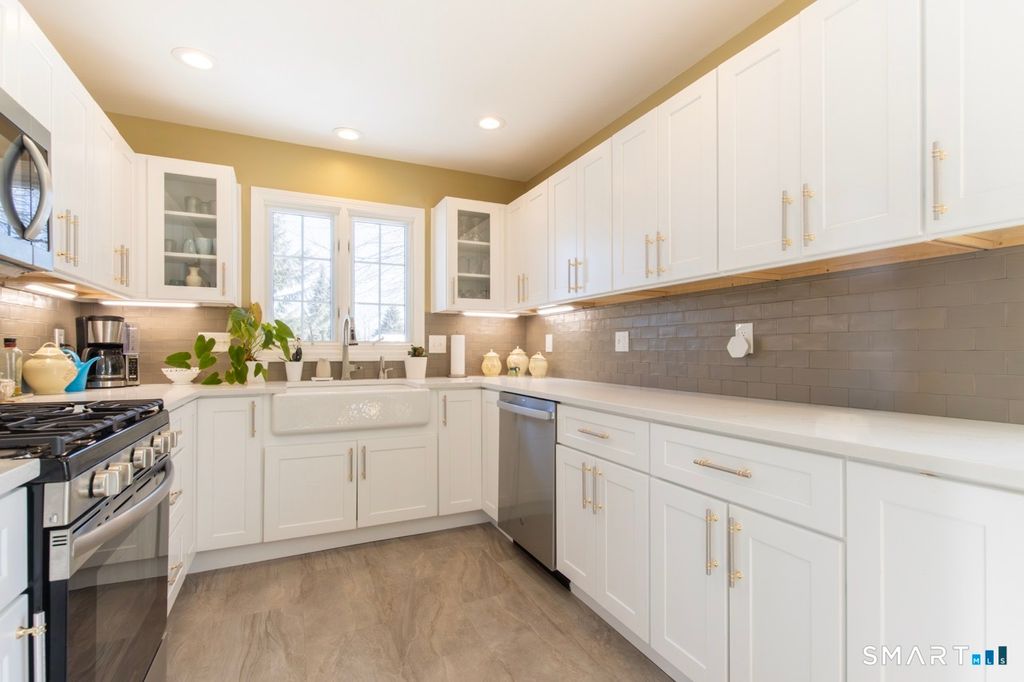 Better than new, this move-in-ready 1st Floor luxury condominium has been beautifully updated and meticulously maintained, featuring hardwood floors throughout the main level, abundant natural light, custom millwork and built-ins, an open floor plan, cathedral ceilings, generous storage, and a living room with a cozy gas fireplace and sliders to a private Trex-style deck overlooking a stunning grassy property framed by classic stone walls and mature trees beyond. The brand-new, fully remodeled kitchen is a true standout, offering all-new flooring, quartz countertops, ceramic farmhouse sink, stainless steel appliances, gas stove, high-end custom cabinetry, and pantry storage. The space is anchored by a charming eat-in area with custom built-in bench seating, creating a warm and inviting spot for casual meals and conversation. The main level includes a spacious dining and living room combination, a library or home office with extensive built-ins, and a primary suite with a full bath featuring both a walk-in shower and whirlpool tub, along with his-and-hers closets. Additional conveniences include a half bath, laundry area, and direct garage access. The finished lower level offers approximately 1,290 square feet (per tax records), providing exceptional space for guests or personal use. This bonus area features new luxury tile flooring, a large family room with full bath, cedar closet, walk-in closet, a rare set of Bilco doors to the exterior-making moving in a breeze.