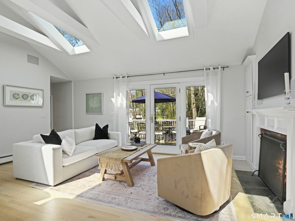 Westport stunning 5-bedroom, 3.5-bath home offers over 4,000 sq ft. of beautifully updated living space on a level 1-acre lot at the end of a sought-after cul-de-sac, just minutes to top-rated schools, beaches, & the many amenities of Westport. Flooded w/ natural light from vaulted ceilings & skylights, the chef's kitchen features a Wolf range & an oversized island ideal for gathering and opens seamlessly to a comfortable living area w/ a fireplace & a wet bar. French doors lead to a TimberTech deck overlooking the private, level backyard, creating effortless indoor-outdoor living. Freshly finished hardwood floors run throughout the home, complementing the bright interiors. The dining room showcases a wall of windows. The family room includes built-in bookshelves/entertainment center, a second fireplace, half-bath and offers access to a bluestone patio, another inviting space to relax or entertain. The primary suite is exceptionally spacious w/ a vaulted ceiling, dual walk-in closets, and a luxurious bath, along with an adjacent bedroom w/ Belvedere balcony, currently used as an office, which could also function as a nursery. 3 additional well-appointed bedrooms, including one ensuite, provide comfort and privacy for family or guests. The basement includes a wine cellar & full-height unfinished space, offering exceptional storage & potential for future expansion. Freshly painted on the exterior, the home also includes a 2-car garage. Enjoy Westport Living at it's finest!