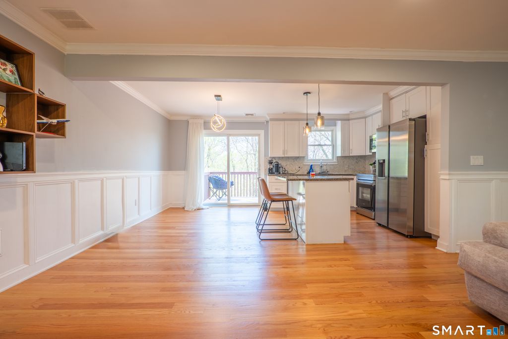 Welcome to 825 Maple Hill Road, a beautifully renovated raised ranch set on nearly an acre in a peaceful Naugatuck neighborhood. this 3-bedroom home offers 1,660 square feet of thoughtfully updated living space. The main level features gleaming maple hardwood floors, custom crown molding, and a stone-accented fireplace that anchors the open-concept living and dining areas. the eat-in kitchen is designed with granite countertops, a center island with breakfast bar, stainless steel appliances, soft-close cabinetry, and a striking herringbone tile backsplash. Sliding doors off the kitchen open to a spacious deck, perfect for entertaining or enjoying quiet mornings. the primary bedroom includes a private en-suite bath with a tiled walk-in shower, while the other two bedrooms share a fully remodeled hall bath with tiled tub. The finished lower level provides additional living space, a half bath, laundry room, and walkout access to the backyard and oversized two-car garage. Key updates include a five-year-old roof, vinyl siding, Andersen windows, modern lighting, and a security system. A detached garage/workshop with electricity offers great space for hobbies or extra storage. This move-in-ready home blends a modern convenience with comfort and style-schedule your showing today. Additional detached shed / workshop with garage door with potential to be used as a 3rd car garage. New Water Heater.