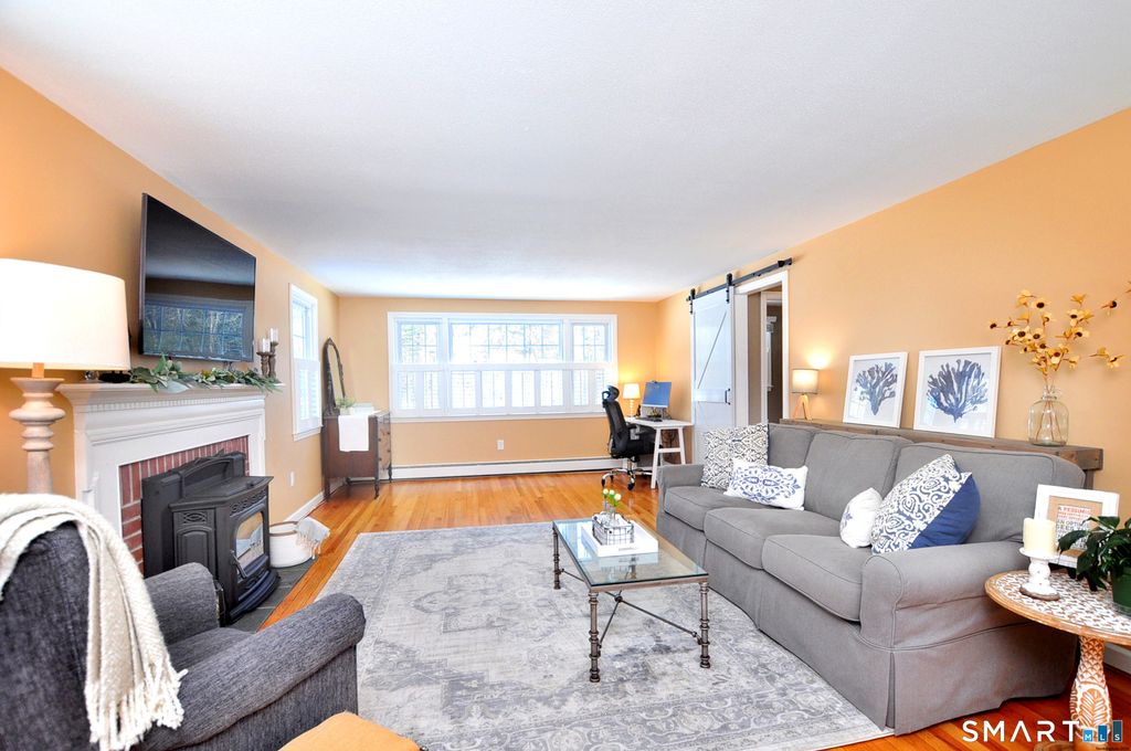 Welcome to this charming New England Colonial home, with 3 bedrooms, 2.1 bathrooms, perfectly situated on a cul-de-sac! The completely renovated kitchen features elegant quartz countertops, soft-close cabinets, stainless steel appliances, and a stylish ceramic tile backsplash. The kitchen flows seamlessly into the family room, complete with ample seating and a cozy pellet stove ideal for cooler weather. The expansive front-to-back living room provides versatile space for entertaining guests or setting up a home office, and a second pellet stove for added warmth. Upstairs, the primary bathroom has been beautifully renovated, while the updated hallway full bathroom and first-floor half bathroom add convenience for everyday life. Hardwood floors run throughout the home, even beneath the carpeting. Downstairs, the partially finished basement is a flexible space-perfect for a home office, gym, or recreation space. Recent upgrades include kitchen in 2020, primary suite in 2014, custom blinds and shutters, an irrigation system in the front yard, paver patio and fresh exterior paint in 2024. Enjoy comfort year-round with the high-efficiency Buderus boiler, 4-zone heating public water, and septic system. Conveniently located across from Squadron Line School and just moments from shopping, coffee spots and parks, this home combines serenity with accessibility. Don't miss the opportunity to make this wonderful property your own!