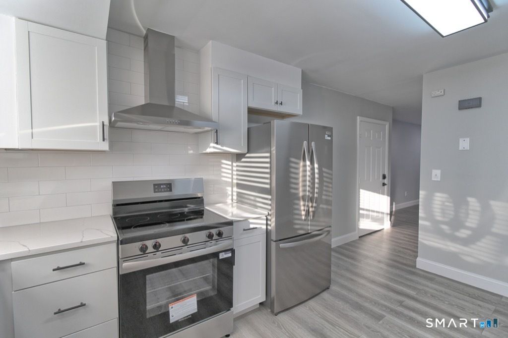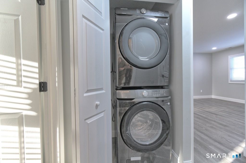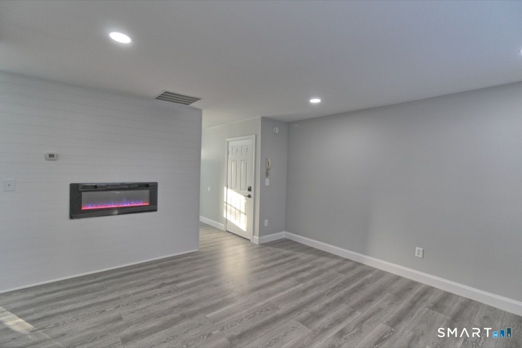 Fall in love with this beautifully renovated 2 bedroom condo!! Wide plank vinyl flooring runs throughout the home, new doors, new trim, modern fixtures, stylish hardware, and recessed lighting for a clean, contemporary feel. The sun filled eat-in-kitchen is a standout, featuring quartz countertops, white shaker cabinets, and stainless-steel appliances. The bathroom is a show stopper, offering a spa like experience with floor to ceiling tile, a walk in shower with a rainfall shower system enclosed by glass doors, and a sleek vanity with mirror. The inviting living room is perfect for relaxing or entertaining, enhanced by a stylish electric fireplace and a shiplap accent wall. Additional conveniences include an in-unit full-size washer and dryer, generous closet space, and an extra-large lower level storage area for all your storage needs. The location is exceptional-walking distance to the train station, Milford Green, local grocery stores, and just minutes from major highways and Milford's beautiful shoreline. Make your appointment today and be the first one to enjoy this stunning, all new condo.
