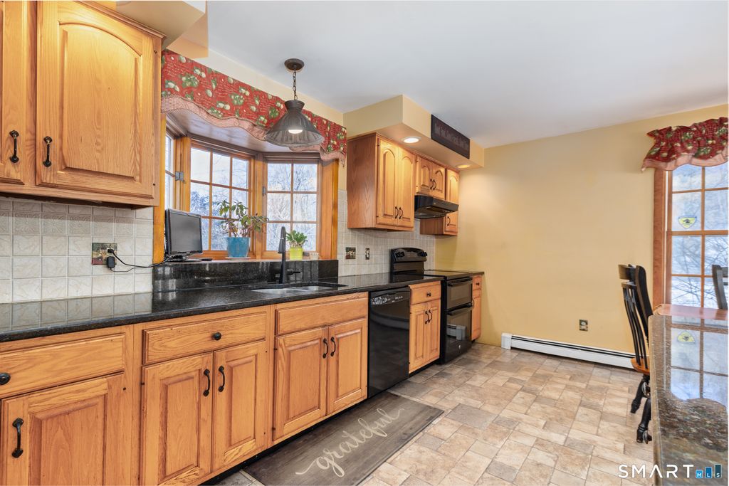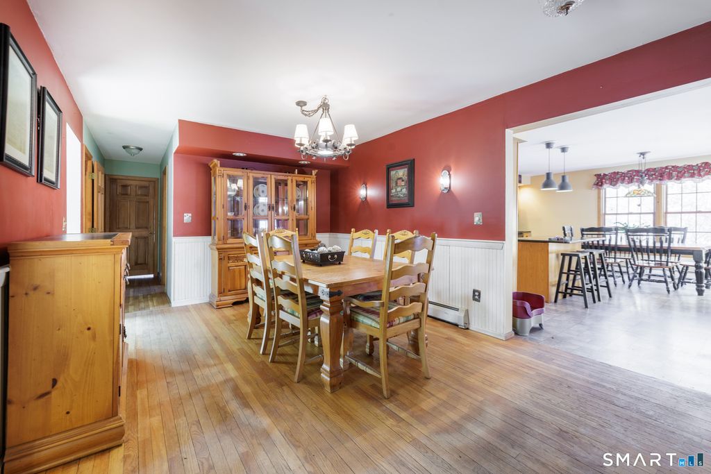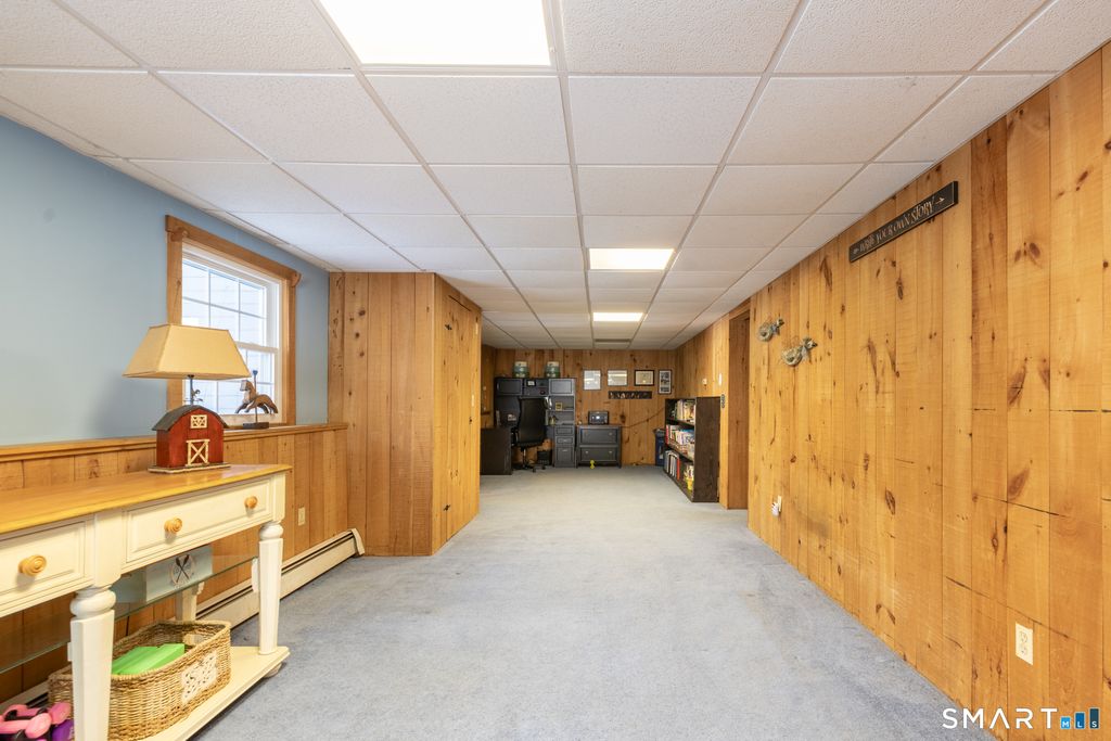 Spacious five bedroom Cape offering flexible living space for today's lifestyle! Bright, oversized kitchen with center island and abundant natural light. A center dining room for gathering. Cozy living room with a wood burning stove adds warmth and charm. The lower level family room features built-in shelving and sliders to the brick patio for easy indoor/outdoor access. A private office with built-in workspace and additional walk-out provides an ideal work from home setup. Seperate laundry room, utility room, and ample storage complete the lower level. The main level includes two bedrooms with hardwood floors, while the upper level offers three large additional bedrooms, including a primary suite, complete with a full bath and a walk-in closet. Set on a large, level yard with newer shed and electric dog fence, ideal for play and pets. Two car, first floor access garage for added convenience. Newer roof for peace of mind. Located within walking distance to Community Park with easy access to I-84 and nearby shopping. Regional 15 Schools!