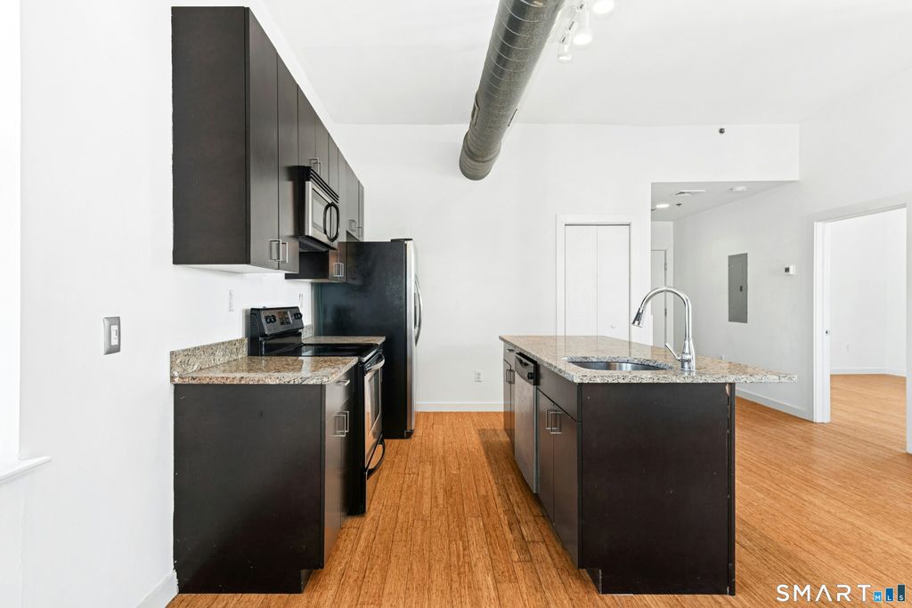 Downtown Bridgeport Loft Apartment in a prime location surrounded by major corporate offices, colleges, restaurants, and city amenities, with easy access to the Webster Arena & Port Jeff Ferry. This well-maintained one-bedroom, one-bath corner loft is located on the 4th floor and offers 910 sq ft of open, sun-filled living space. Features include exposed brick, high ceilings, industrial details, oversized windows, an open-concept kitchen with granite countertops and stainless steel appliances, in-unit washer and dryer, and fresh paint throughout. Additional highlights include a brand-new HVAC system installed June 2023, one assigned parking space, and an immaculately maintained building with security systems. Strong rental demand in the downtown corridor makes this an excellent investment opportunity or low-maintenance owner-occupied option. Elevator building. Move-in ready.