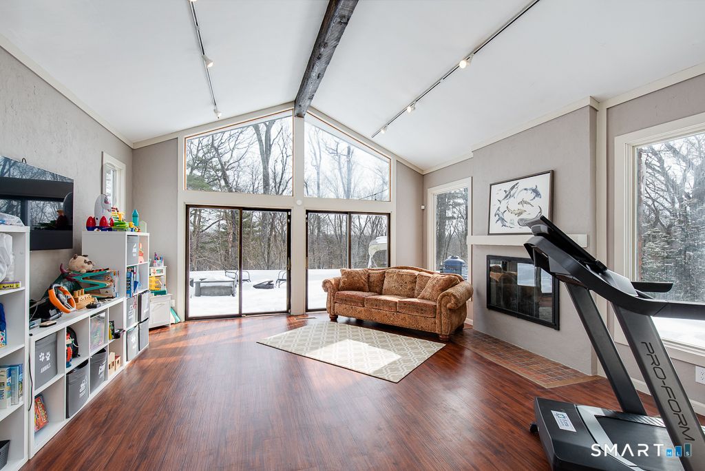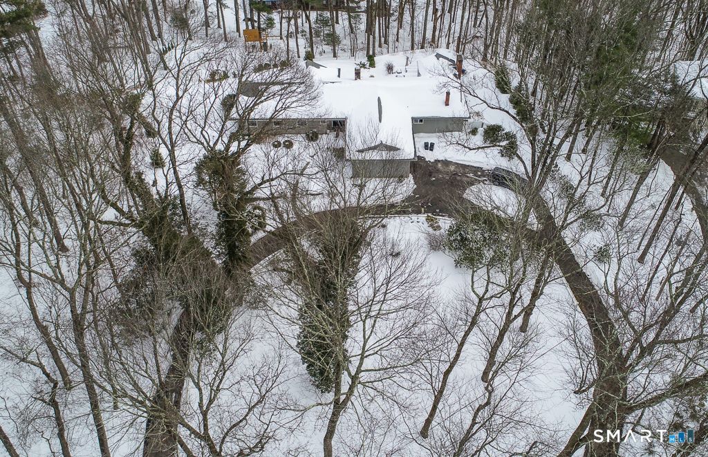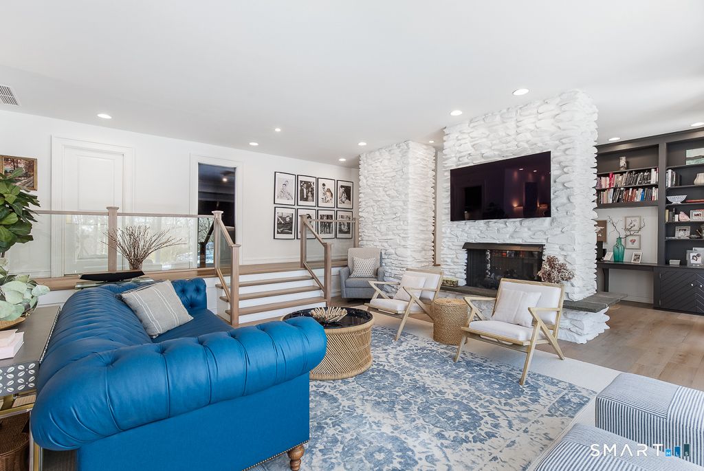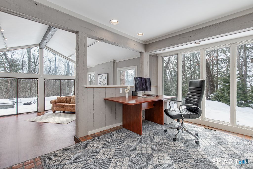Privately situated on 1.73 acres in Central Woodbridge, is a stunning and comfortable contemporary ranch-style home with 4 bedrooms, 2 full bathrooms, 2 half bathrooms and approximately 4127 sq ft. This home was built in 1968 and designed with an open floor plan that is enhanced by large windows for beautiful natural lighting. From the stylish front entry foyer, the space flows easily down a hallway to a media room (perfect for watching your preferred entertainment) and to the step-down living room w/10ft+ ceilings. The living room has a 2-sided gas fireplace which includes a separate office area with built-in book shelves. The living room steps-up to the formal dining room which has a sliding door to the bluestone terrace for al fresco dining in warmer weather. The dining room leads to a 2nd office area (through French Doors) and to the adjoining kitchen which has a Viking 6 burner gas cooktop, stainless steel refrigerator and dishwasher, granite counters, 2 bay sink, recessed lighting, lots of cabinet storage, and a separate breakfast room. There is also a very spacious family room with a gas fireplace and vaulted ceiling that has sliding doors to the bluestone terrace. Most of the flooring throughout the home is wide-plank wood flooring that was recently installed. The spacious primary bedroom has new large windows, a new door to the terrace, & a beautiful walk-in closet. The primary bathroom has 2 sinks, a shower stall, a sauna, skylights, and a whirlpool tub.