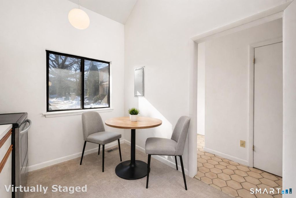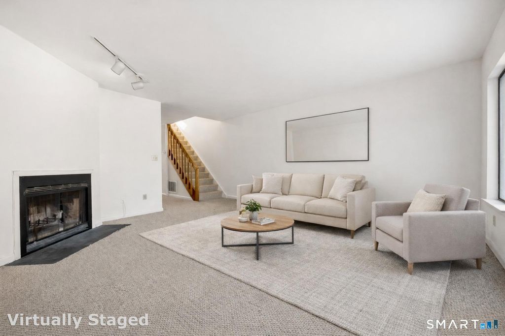 Enjoy gated community living in the heart of Stamford. This 1-bedroom, 1.5-bath townhouse in The Chesterfield. The main level includes a kitchen with an eat in kitchen, cathedral ceilings with a skylight, and a living room featuring a wood-burning fireplace and sliders to a deck-perfect for entertaining-plus a separate dining area and convenient half bath. Upstairs, you'll find a spacious bedroom with generous closets and storage, along with a full bath offering a soaking tub and double vanity. Additional perks include an in-unit washer/dryer, new HVAC, and flexible extra space ideal for guests or a home office. This gated community offers two pools and 24-hour security, with unbeatable access to shopping, transit, I-95, the Merritt Parkway, and downtown Stamford-schedule your private showing before it's gone.