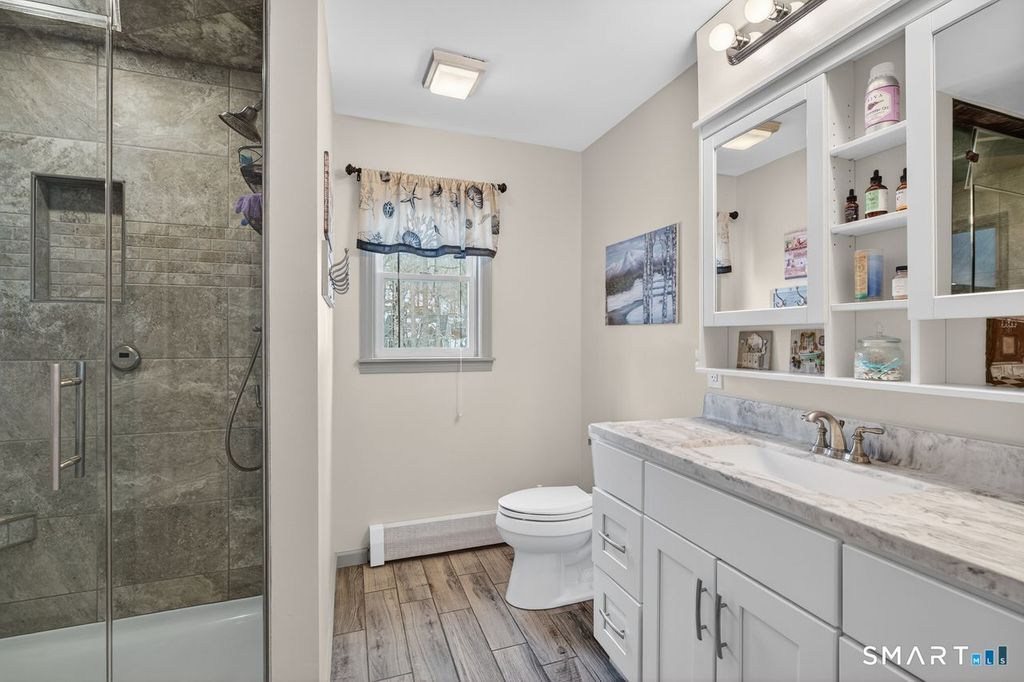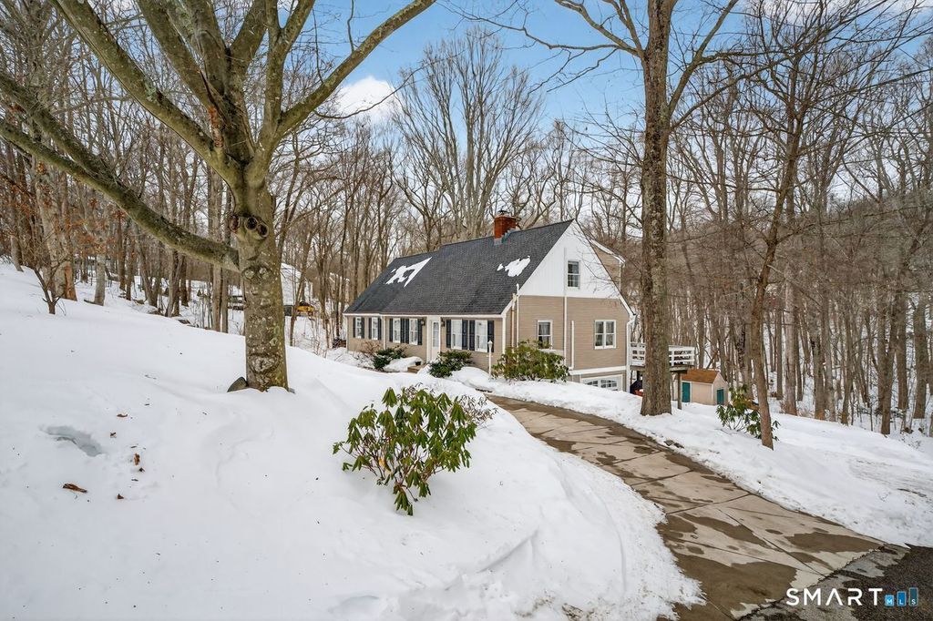 Good design is all about the details and this custom Cape with a spacious open floor plan simply has it all. Recently renovated and offering desirable one floor living, the current owner's signature style has magically taken this charming home from ordinary to extraordinary. A welcoming entrance leads to a front to back living room centered around a wood burning stove and opens to a Chef's kitchen with a center island...perfect for everyday gatherings. Offering the perfect balance relaxed and refined the spacious light-filled dining room is ideal for entertaining. A true highlight is the first floor primary suite with a walk-in-closet and beautifully updated bath with a steam shower. The first floor mudroom/laundry area is perfect for pets and offers easy access to the outdoors. Upstairs you will find two well-appointed bedrooms with a shared bath and a finished space for all of your storage needs. The partially finished lower level area offers homeowners a variety of options with a full bath, sauna, a small kitchenette and large bonus room...perfect for in-home office, recreation room, work-out space, studio, guest area, or possible in-law suite. Prominently set on just over an acre, a private deck overlooks park-like grounds bordered by natural rock out-cropping's and a variety of stately trees that adorn the property. Whether you are looking for a full time residence or the ideal weekend retreat this magnificent property is the perfect place to call home.