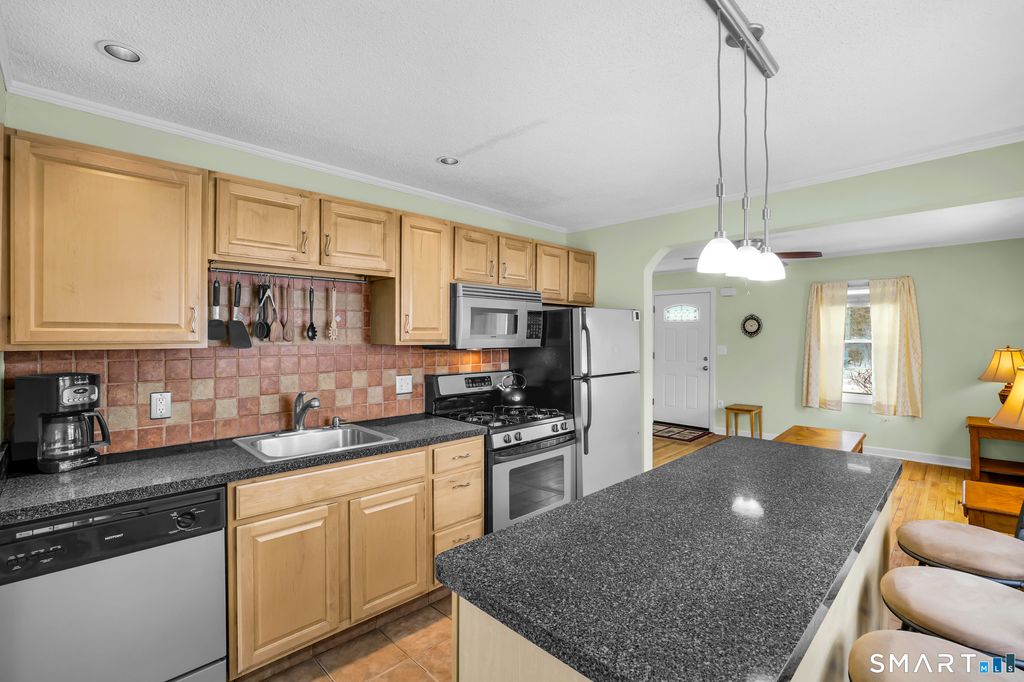 At just the right size and full of charm, 6 Norwich Lane offers easy one level living with thoughtful updates and inviting spaces throughout. This 2 bedroom, 1 bath ranch blends classic character with modern touches, creating a home that feels both comfortable and move in ready. Step inside to find hardwood floors in the living room and primary bedroom, a light filled layout, and a welcoming atmosphere that instantly feels like home. The kitchen is designed for both everyday living and entertaining, featuring granite counters, a breakfast bar, center island, dining area, and direct access through French doors to the deck, perfect for summer evenings and morning coffee. Central air keeps things comfortable year round, while natural gas heat adds efficiency. The full bath offers a tub with shower and tile flooring, and the main level laundry room provides added convenience. Downstairs, the full unfinished basement with hatchway offers excellent storage or future finishing potential. Outside, the level yard is fully fenced with privacy fencing, ideal for gatherings, pets, or simply enjoying your own outdoor space. Public water and sewer add peace of mind, and the location offers easy access to local amenities while maintaining a neighborhood feel. If you are looking for a home that is manageable, stylish, and ready for its next chapter, 6 Norwich Lane is one to see.