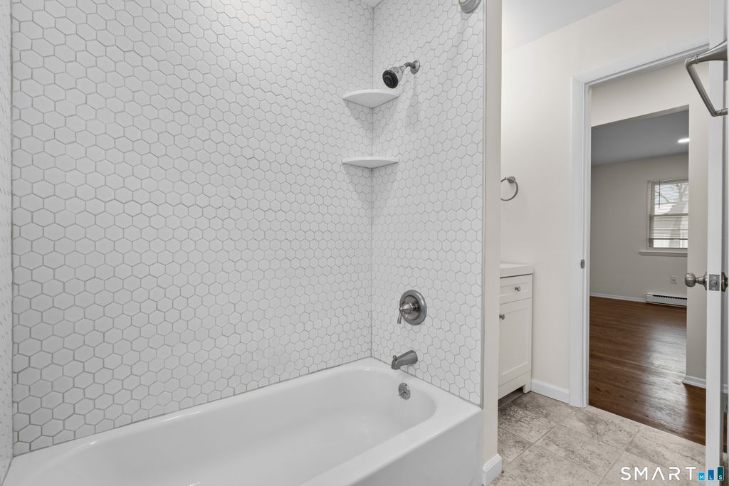 This recently renovated 2nd floor 2-bedroom, 1-bathroom apartment showcases an inviting open-concept layout, boasting gleaming hardwood floors, recessed lighting that accentuate its modern aesthetic. The modern kitchen and renovated bathroom are sure to impress! Kitchen also leads out to a private backyard area. Two spacious bedrooms adorned with recessed lighting. Abundant parking ensures convenience for residents and guests alike, while the oversized unfinished basement offers ample storage space and a dedicated laundry area, enhancing practicality and organization. Situated on a quiet street, this residence offers proximity to scenic waterfronts, parks, bustling downtown Stamford, and convenient access to the train station and I-95 for commuting. Enjoy the amenities in Old Greenwich - also just a few minutes down the road. **New water heater installed in September '25, and 4 window AC units will be included **
