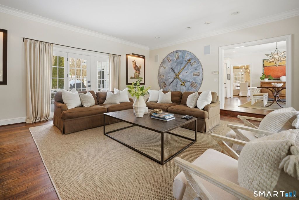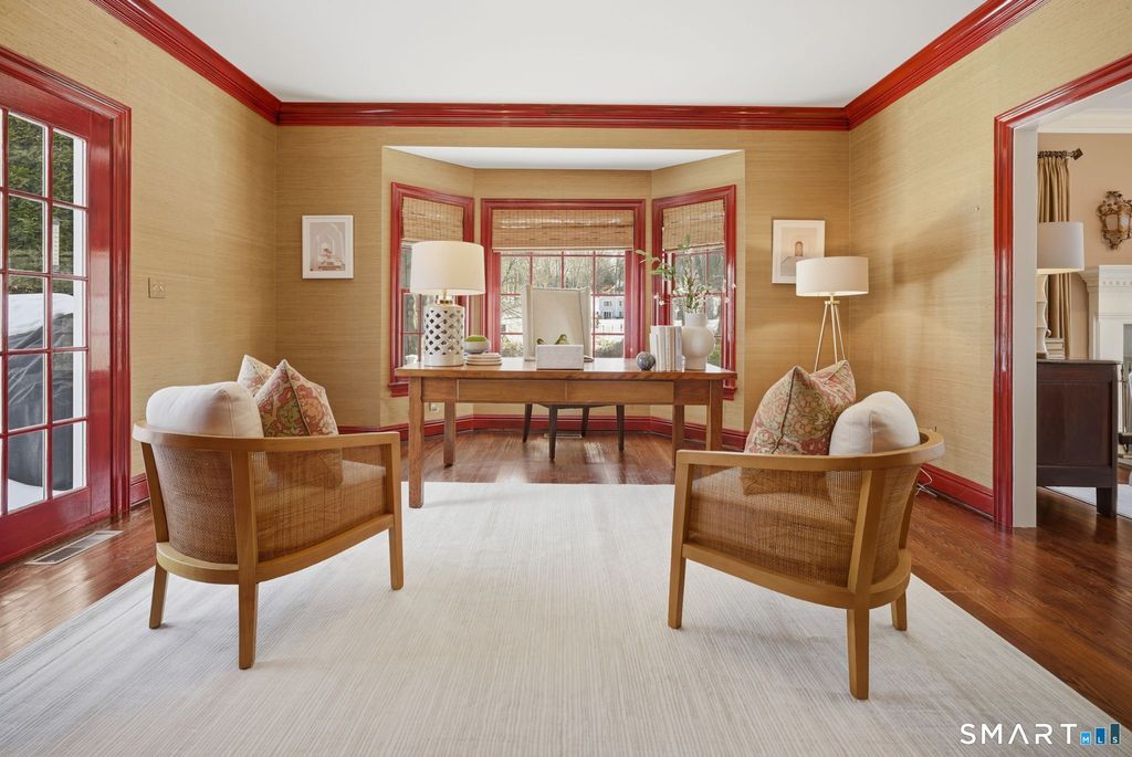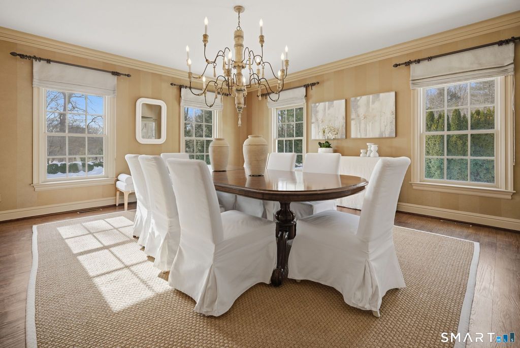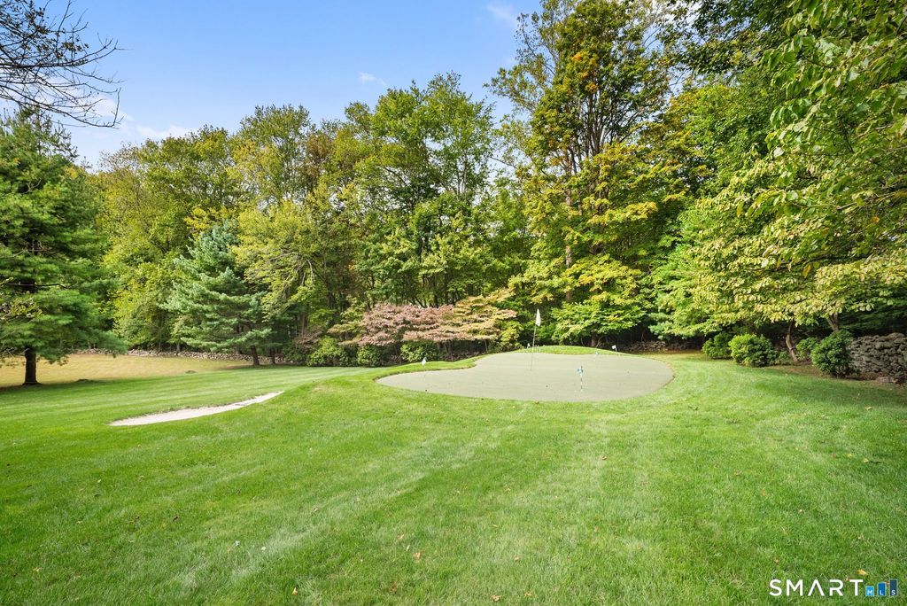 One approaches 1380 Old Academy Road through a stone wall, where a paved drive opens to a gravel courtyard arrival framed by mature trees and open skies. Old Academy is the kind of street where homes feel settled rather than transitional, and where people arrive, put down roots, and tend to stay. Inside, the house is generous without feeling oversized. Tall ceilings, dormers, and bay windows draw natural light deep into the living spaces, allowing it to move easily throughout the day. The main living areas are grounded by multiple fireplaces, and the layout supports everyday living with ease while expanding naturally when the house is full. The finished lower level adds meaningful flexibility, with room for fitness, media, or wine storage. A cabana-style mudroom with a full bath and direct outdoor access extends the way the home lives across seasons. Upstairs, the bedrooms are designed with privacy in mind, offering thoughtful connections that work well for both family and guests. Outdoors, the property becomes a destination in its own right. A Gunite pool bordered by stone terraces, an outdoor fireplace, a putting green, and a side porch with rocking chairs create spaces meant for lingering rather than passing through. Manicured grounds, full irrigation, and a three-car garage complete the setting. Carefully maintained and continually improved, this is Greenfield Hill living that feels grounded and enduring. A home that continues to work season to season, year after year