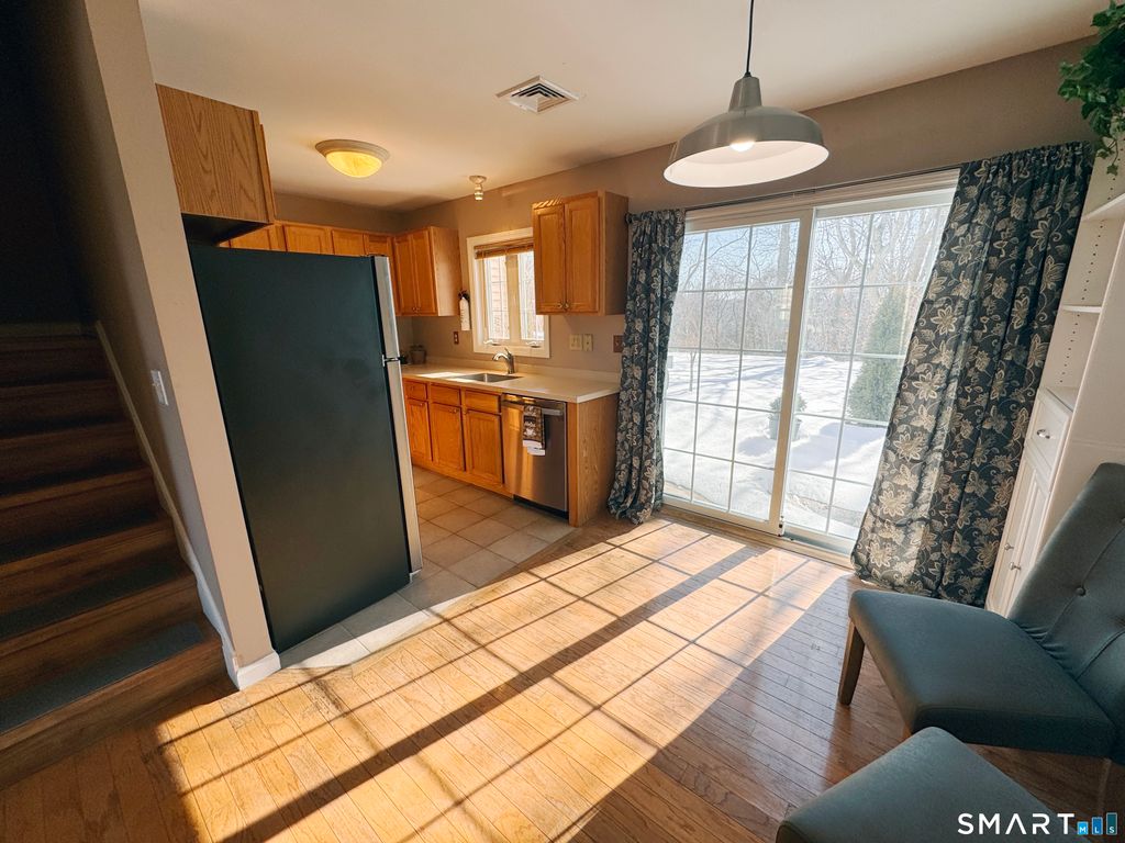 A beautifully maintained townhouse in the sought-after Bridgewater Estates, offering comfortable living and thoughtful upgrades throughout. This spacious 2 bedroom, 1.5-bath residence features an expansive third-floor bonus room, perfect as guest area, home office, bonus space, or additional storage. Sunlight pours into the kitchen and dining areas, where sliding glass door leads to a private patio ideal for morning coffee or evening relaxation. The living room is anchored by a charming fireplace, creating warmth and ambiance, while central A/C ensures year-round comfort. The kitchen is appointed with newer stainless steel appliances, and the convenience of an in-unit washer and dryer on the second floor enhances everyday living. Recent improvements include a new HVAC system (2020), water heater (2018), sliding door (2023), front window (2021), updated flooring on the stairs and second floor, and plush new carpet on the third floor. Ideally located near Washington Park, Electric Boat, the Sub Base, Pfizer, shopping, dining, and easy highway access. This move-in-ready home offers low-maintenance living with two assigned parking spaces just steps from the front door.