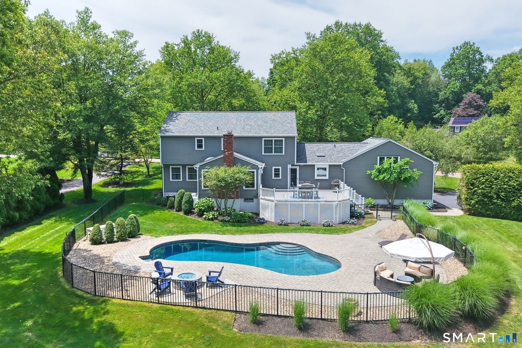 Tucked away on a quiet, highly sought-after street in the desirable Daniels Farm neighborhood, this gracious 4-bedroom, 2.5-bath colonial offers over 3,100 square feet of refined living space designed for both comfort & effortless entertaining. The heart of the home is the beautifully renovated kitchen, a true gathering place featuring an abundance of custom cabinetry, a generous center island-perfect for hosting, or everyday meals, & a bar area complete with 2 beverage/wine refs. Just off the kitchen, the oversized family room above the garage impresses with vaulted ceilings & an airy, light-filled ambiance. A 2nd expansive family room offers a more intimate retreat, highlighted by a classic fireplace & rich hardwood floors. The main level also boasts a formal dining room ideal for holidays, a large welcoming foyer with double closets, and a versatile living room currently used as a home office. An additional office space, now enjoyed as a yoga room, provides flexibility to suit your lifestyle, a main level laundry & guest bath complete this level. Upstairs, 4 generously sized bedrooms all feature hardwood floors. The spacious primary suite is its own haven, complete with an ensuite upgraded bath with stall shower and large vanity as well as a walk-in closet. Step outside to discover a truly spectacular backyard oasis. A maintenance-free composite deck that overlooks the heated inground Gunite pool, surrounded by stunning hardscape and professional landscaping.