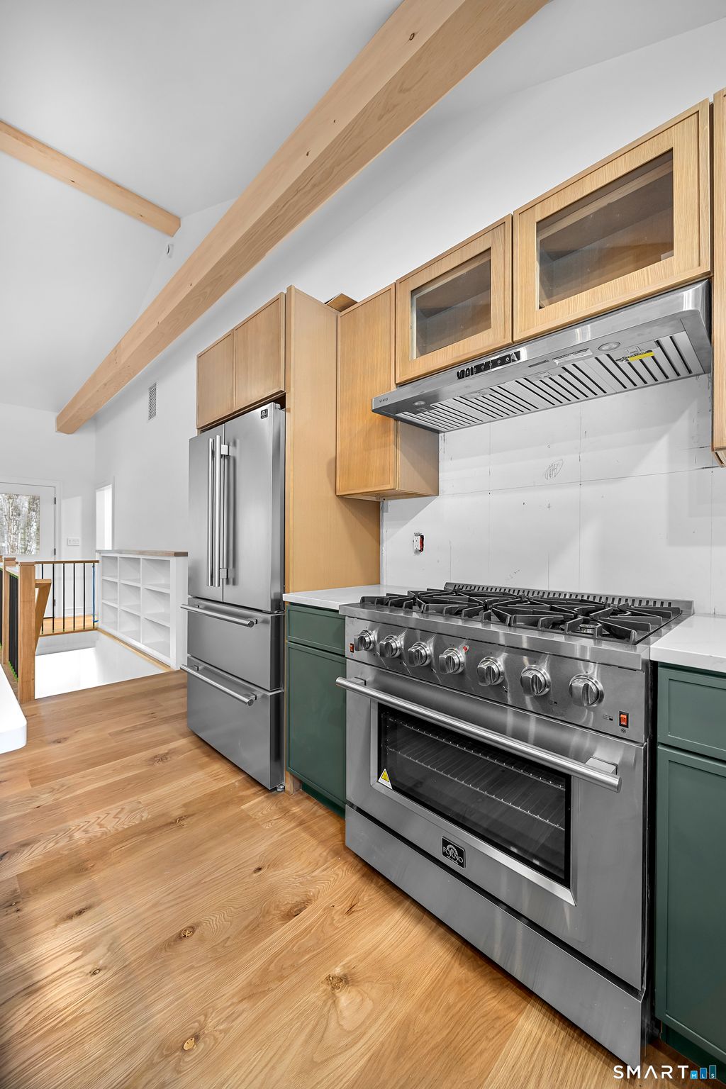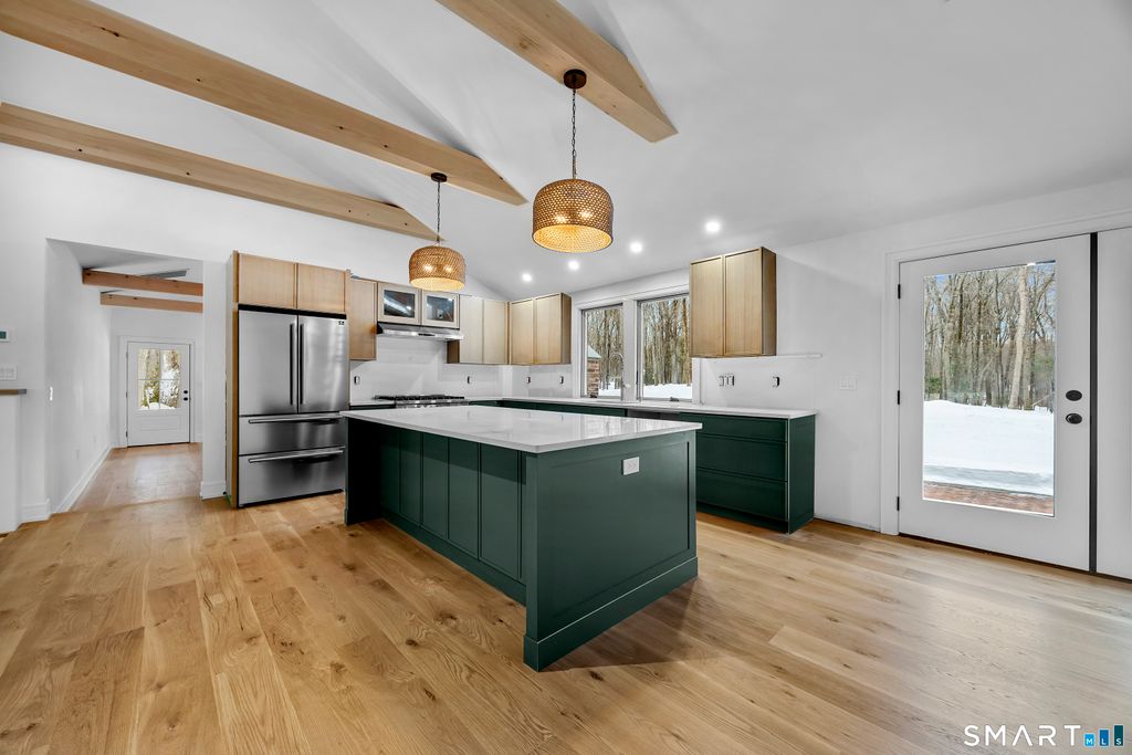 Completely reimagined from the studs up, this stunning home showcases uncompromising quality throughout. The exterior is finished w/ new Hardie Board siding, Pella windows, ODL doors, & a 30-yr architectural roof. All HVAC systems are new, incl dual natural gas furnaces & AC units, a LL ductless split system, on-demand tankless HW, & spray foam insulation across the above-grade living space for exceptional efficiency. Inside, wide-plank 8" white oak floors finished in Bona Natural set a refined tone. The custom kitchen is both striking & functional, featuring bespoke cabinetry w/ a dark green 8' island, natural uppers, quartz counters, & a premium Forno SS appliance suite incl a 36" gas range, French-door fridge/freezer, & microwave drawer. The main living area serves as the architectural centerpiece, highlighted by soaring ceilings & exposed pine beams. The primary suite offers vaulted ceilings, custom detailing, a walk-in closet w/ built-ins, & a spa-inspired bath w/ curbless glass shower, textured tile, & Moen fixtures. Two add'l BRs feature custom closets. A mudroom connects to a spacious laundry rm. The finished walk-out LL adds versatile living space & a full bath. Outdoor living shines w/ a herringbone brick patio, fireplace, & covered bluestone porch overlooking expansive grounds. This home delivers the comfort and efficiency of new construction paired with one-level living, a rare opportunity not to be missed.
