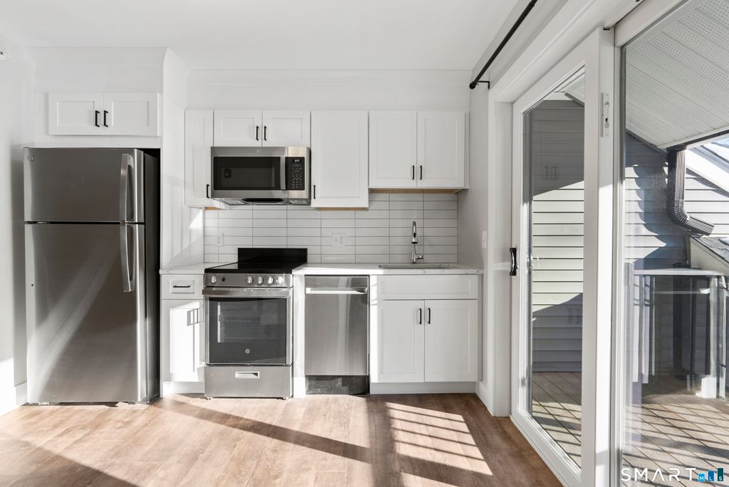 Welcome home to Simsbury Center Apartments, offering seamless live-work-play convenience just steps from downtown Simsbury's vibrant amenities. This fully renovated building boasts a chic modern farmhouse design, starting with a welcoming lobby featuring a cozy fireplace and seating area-ideal for gathering before a night out on the town. Premium finishes throughout ensure an elevated living experience that exceeds expectations. This well-laid-out studio in Unit 205 is perfect for simplified luxury living, whether you're downsizing, launching a career, or seeking an effortless lifestyle. Enjoy complimentary high-speed Wi-Fi and hot water included in your rent, along with the convenience and security of key fob access to the building and your unit. Inside, discover high-efficiency central heating and air conditioning, stainless steel appliances (refrigerator, microwave, oven, dishwasher, and in-unit washer/dryer), and a spa-inspired bathroom with a deep tub, custom tile surround, and premium fixtures. The gourmet kitchen is a chef's delight, featuring sleek quartz countertops, custom shaker soft-close cabinets, and a stylish tile backsplash. Step out onto your private balcony for fresh air and serene views, or take advantage of community perks like the expansive outdoor resident patio with grilling stations, four EV charging spots, a dedicated pet walking area, 24-hour surveillance, and professionally designed landscaping. Experience boutique luxury at its finest!