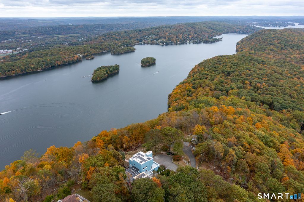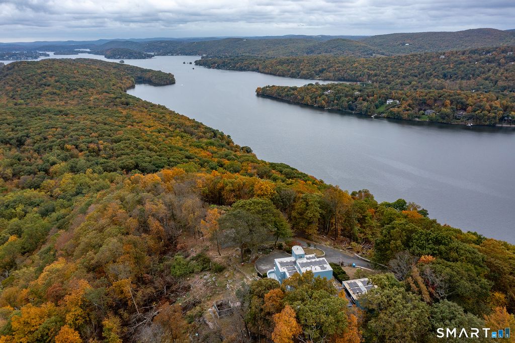 It's All About the Views!Fabulous Price Reduction on this one of a kind, custom built contemporary with extraordinary 50 mile views in all directions. Set in the Lake community of Candlewood Lake Estates, this stately Contemporary, set on a private acre plus an additional lot (.82 acs), at the end of a cul-de-sac, is just waiting for your customization. This incredible setting hosts this 3 bedroom,2.5 bath custom designed home with multilevel wrap decks & balconies and an oversized bonus room for great family fun center or studio for the artist/photographer. An open plan showcases. slate floors, custom built-in cabinetry plus a great room open to dining room & efficient galley kitchen topped with granite. A second floor primary suite offers a large, walk-in closet, loft sitting area with desks & bookcases, full bath w/marble counters, another half bath, balcony & ultimate views! Stone walls encircle the home site & meandering paved drive plus additional parking area that can house 10 -12 cars, 2 sheds & even a chicken coup. An idyllic, serene setting in the sought after lake community of Candlewood Lake Estates with scenic beaches on Candlewood Lake and swim in crystal clear Green Pond. Optional dock available for an extra fee. Close to town center, New Milford shopping & an easy NY commute! Come and discover this unique lake front retreat! Opportunity to upgrade & add on to make it the home of your dreams! Low taxes, privacy, close to shopping & train. 70 min to NYC!