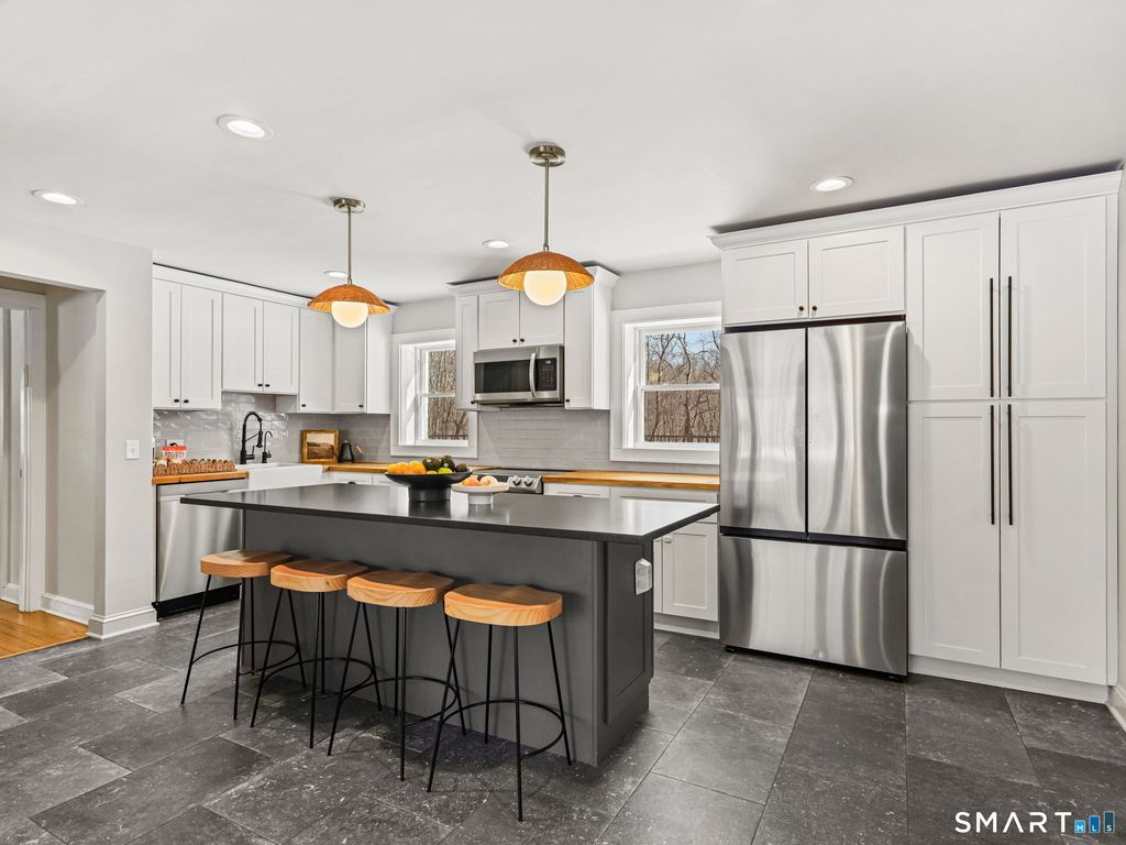 Located in the highly desirable Umpawaug section of West Redding, this exceptional home offers privacy, character, and convenience just minutes to shopping, dining, schools, train and only 60 miles from Manhattan. Set on over 2.5 acres abutting 85 acres of town owned open space, the property provides a rare combination of usable land and protected natural surroundings in a prime location. The chef's kitchen features white shaker cabinets with crown molding, butcher block counters, a dark gray island accented with a dark stone top complete with a farmhouse sink. It opens to a living room with stone fireplace and reclaimed wood mantel. The formal dining room w/ second fireplace showcases a brand-new 16' wide wall of floor-to-ceiling glass sliders that flood the space w/ natural light & open to a new composite deck w/ black rail system and brand-new patio with fieldstone knee walls. Extensive hardscape improvements create ideal outdoor living and entertaining space. The exterior showcases striking stonework accents, newer roof and a contrasting color scheme that enhances curb appeal. Updated baths offer modern finishes. The 2nd floor includes 2 bedrooms plus office/nursery; the main level features a spacious primary bedroom with walk-in closet. Per town, septic updated in '22 supports 4 bedrooms, offering expansion potential. Experience the rare blend of privacy, natural beauty & timeless New England charm that makes Redding one of Fairfield County's most treasured towns!