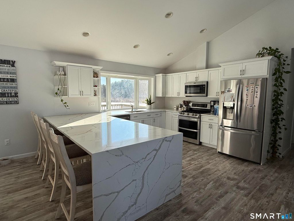 Beautiful and bright raised ranch in Killingly built in 2019, offering 4 bedrooms and 3 full baths on 6.5 private acres with potential to subdivide. The open-concept layout is great for entertaining, featuring a stunning kitchen with Corian countertops, waterfall island, stainless steel appliances, cathedral ceilings, recessed lighting, and a large picture window overlooking the deck and backyard. The kitchen flows into the dining area with slider to a spacious deck and pool area. The master suite includes a full bath with double sinks. Two additional generously sized bedrooms and a full half bath with laundry complete the main level. The finished lower level has a 4th bedroom, full bath, and walkout access. Enjoy central air, central vac, propane heat with owned underground tank, tankless hot water, 2-car garage, paved driveway with basketball hoop, and serene acreage for animals, gardening, or privacy.