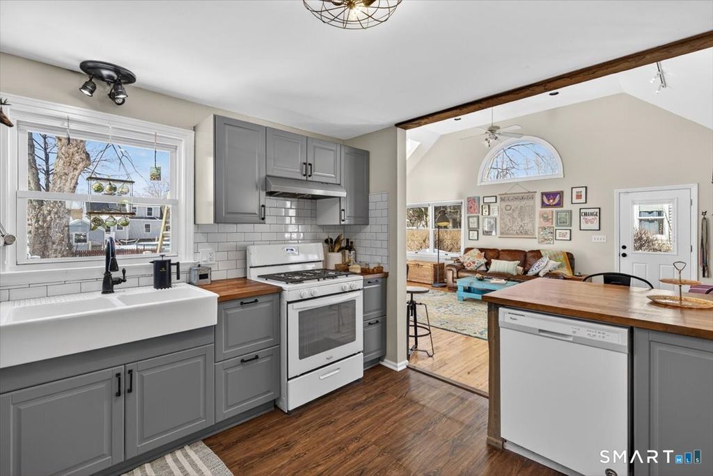 Every inch of this home tells a story! The artist in you will certainly appreciate the eclectic vibe the minute you enter. This charismatic cape has it all; starting with a sun filled, spacious living room with cathedral ceilings, hardwood floor, brick fireplace and sliding doors that lead to a newly installed deck area. Uniquely designed kitchen with a double bowl, farmhouse sink, luxury laminate flooring and functional kitchen island adorned by industrial style lighting will inspire the chef in you. Formal dining room is as informal as it gets, just a fun space to share a meal with those you love. There are two sun filled bedrooms on the main level and equally inviting two bedrooms on the upper level. Additionally, a full basement offers tremendous possibilities. Stunning, private backyard, off street parking, perennial garden and so much more make this home a true gem, and a must see!