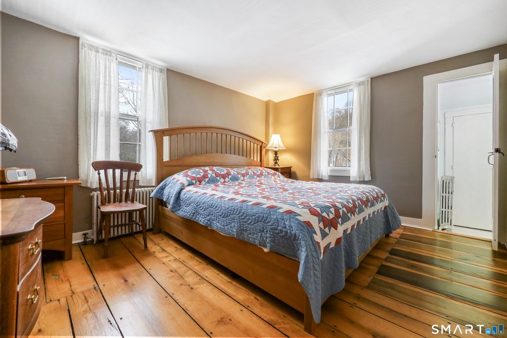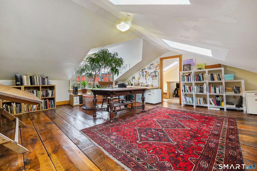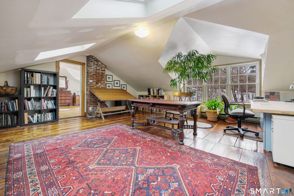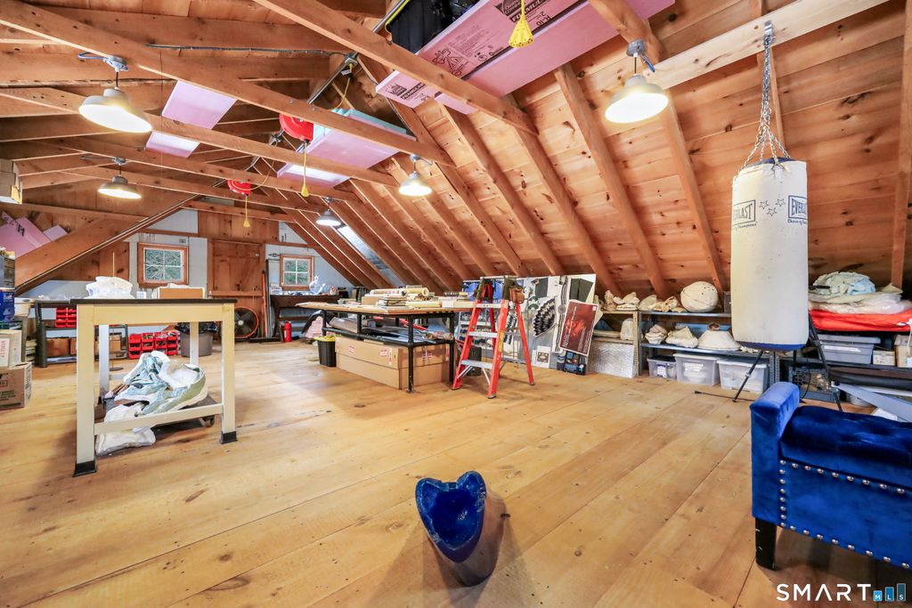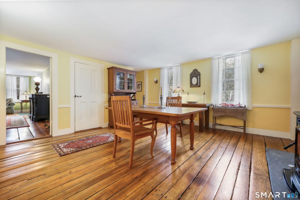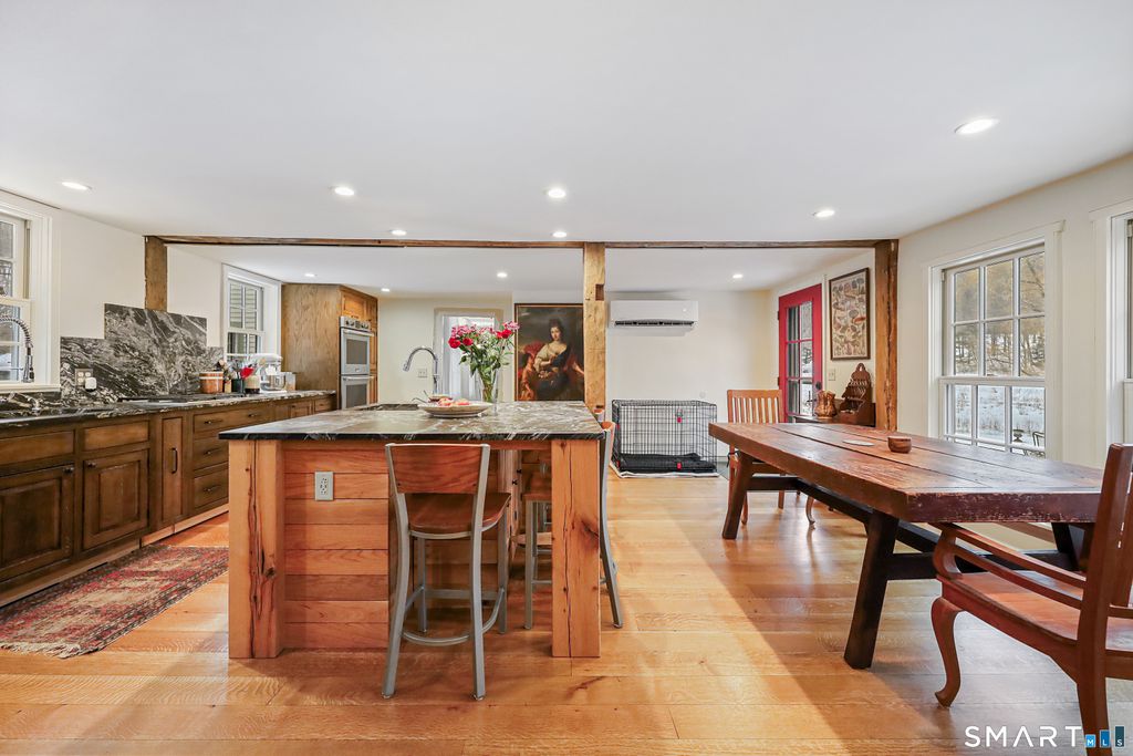 Discover the perfect blend of historic New England charm and modern comfort in this 1825 farmhouse set on nearly 8 acres of open fields, mature landscape, and a serene stream fed pond. This 4 bed, 3.5 bath home offers an inviting farmhouse style with thoughtfully updated spaces, original architectural details, and room to live, work, and play. A new custom country kitchen serves as the heart of the home, featuring handmade cabinetry crafted by a master woodworker, sueded granite countertops, stainless steel appliances, and a gas range. Adjacent is the formal keeping room, showcasing the original hearth with beehive oven, a pellet stove insert-an ideal gathering space with timeless character. Additional first floor living areas include a formal living room with fireplace insert and a cozy library/sitting room. A first-floor bedroom/den with ensuite half bath provides flexible living options. Upstairs, three additional bedrooms are complemented by a bright study/family room with skylights and a roughed in second story bathroom, offering potential for future expansion. Three separate staircases add to the home's historic charm and functionality. Original wide board chestnut floors run throughout, paired with newer mechanicals, a newer roof, and freshly painted interiors. The historic three-story 1900s post and beam barn stands as a centerpiece-ideal for storage, livestock, or creative use. A newer detached 3 bay barn, radiant heat, EV charger, and full 2nd story studio.