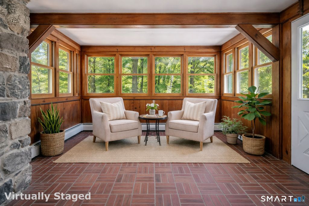Privately positioned on over 5 secluded acres on Danbury's coveted west side, this elevated residence commands the landscape w/quiet confidence. Its hillside setting delivers expansive western light, sweeping sunset views, and rare privacy - all just minutes from the NY border. The metal gate entrance welcomes you to a long, private drive that winds through mature trees & rolling lawn before revealing the home, perfectly integrated into its natural surroundings. The approach feels intentional, understated, and exclusive. The west-facing stone patio anchors the outdoor experience. A custom cascading waterfall, framed by natural rock, creates a tranquil focal point where the sound of moving water enhances every sunset. A private retreat designed for presence and pause. Inside, character and warmth define the architecture. An original stone fireplace, exposed beams, natural wood detailing, & expansive windows create depth & authenticity. The 4-season sunroom invites year-round connection to the surrounding landscape, filling the interior w/natural light. The kitchen balances modern function with a timeless aesthetic, offering clean lines & a generous workspace. Main-level bedrooms provide ease & comfort. Upstairs, a flexible bonus space adapts effortlessly as a 3rd bedroom, private office, or artist's studio. The lower level offers laundry, storage, & access to the 2-car tandem garage & outdoor storage. An oversized detached 2-car garage adds versatility for vehicles or hobbies.