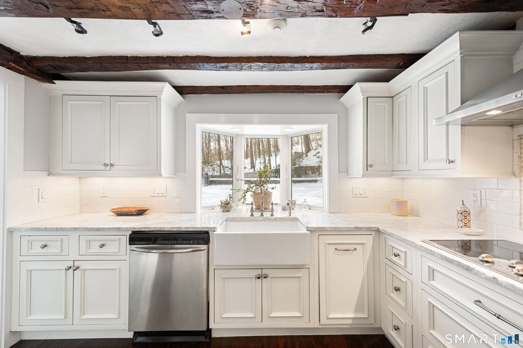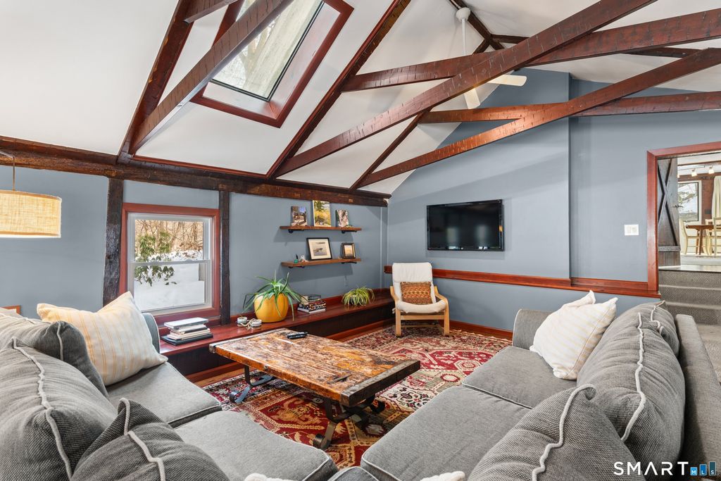 A rare and beautifully updated New England Cape offering timeless character and a private backyard retreat with heated in-ground pool and newly designed patio and outdoor fireplace. Inside, old-world craftsmanship blends seamlessly with refined updates. The gourmet eat-in kitchen is filled with natural light and features white granite countertops, a basket-weave marble backsplash, premium stainless appliances, double ovens, wine refrigerator, and a bay window overlooking the fenced pool area and outdoor stone fireplace - perfect for entertaining. Architectural details include a dramatic original stone wood-burning fireplace, wide plank floors, exposed beams, curved wood spindle staircase, skylights, and authentic period elements throughout. Thoughtful upgrades include newer roof and gutters, central air, blown-in insulation, renovated designer bath, new oil tank, new pool pump and newer paved driveway. Spacious sunlit bedrooms, beautifully updated baths, open living spaces, and seamless main-level access to the pool and level yard complete the home. Ideally located in Southern Bethel, 5 minutes to Metro-North for effortless New York commute.