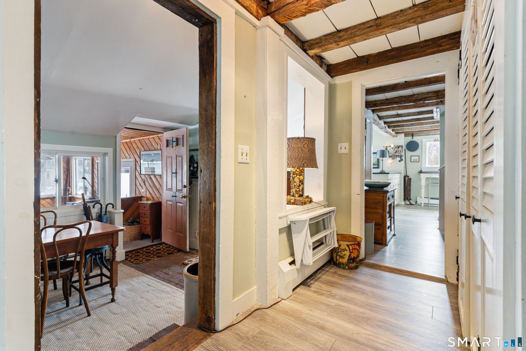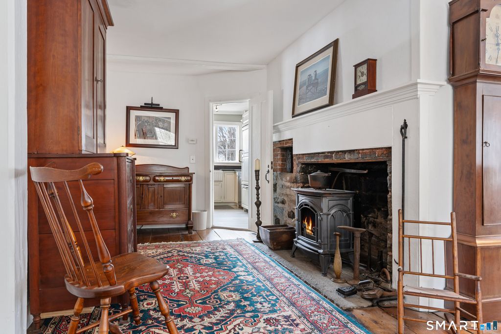 Discover the vibrant energy of the historic town green just outside your doorstep. The inviting sidewalk guides you to the lively center, only 600 yards away. There, you'll find a treasure trove of quaint shops, restaurants, the recreational center, and cozy coffee spots to enjoy. Join in the community spirit at concerts and local events, and explore the area's rich history and character-all while residing on a spacious, nearly one-acre lot that offers a peaceful, private atmosphere. Experience the perfect fusion of timeless distinction and modern elegance in this well-maintained home, where original architectural craftsmanship has been beautifully preserved, and recent updates have brought a fresh, stylish feel to the space. Inside, you'll discover an inviting and versatile residence with numerous unique features that make this property truly one-of-a-kind. Enjoy the warm ambiance created by wide plank wood floors, original woodwork, exposed beams, and multiple fireplaces across the family room, living room, dining area, and primary bedroom. The home features 4+ bedrooms, thoughtfully arranged across two levels for privacy and comfort. Two hall-accessed bathrooms-one with a tub and one with a shower-occupy the second floor, both easily accessible from the hallway. The updated kitchen is an entertainer's dream, featuring leathered granite counters, a Subzero refrigerator, and an LG gas stove.
