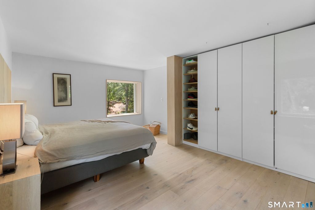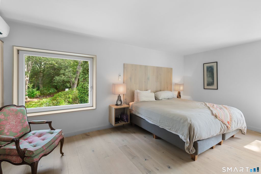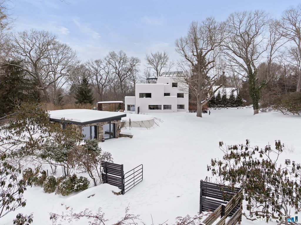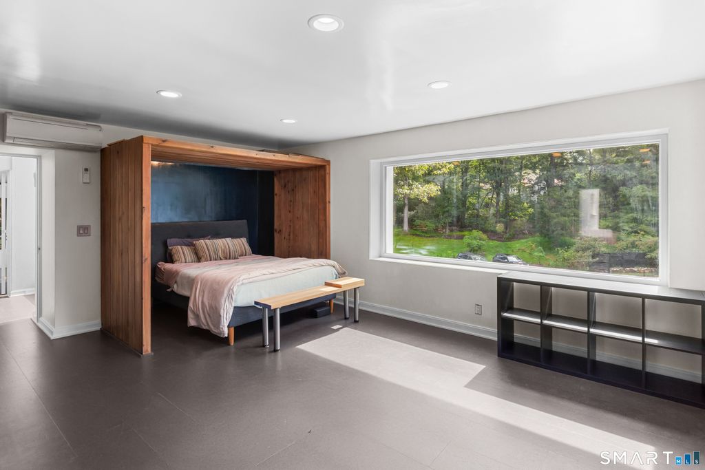 This Westport residence is a meticulously executed Passive House retrofit of a modernist concrete home originally built in 1938. Few properties achieve this level of energy efficiency while also prioritizing non-toxic, health-conscious building materials. As you pass through the home's front entry gate and hear the gentle rhythm of tires over gravel, a striking and handsome facade comes into view-an arrival that feels both intentional and memorable. The setting immediately conveys a sense of privacy, character, and architectural distinction. Your attention is naturally drawn to one of the most distinctive features of property: the Frazier Peters outbuilding. Rich in charm and architectural interest, this versatile structure offers exceptional flexibility-equally suited as a private office, creative studio, retreat, or state-of-the-art gaming lounge. The space adapts effortlessly to your vision and lifestyle Originally designed by Frank Lloyd Wright protege Francis Barry Byrne, the home is a masterwork of form, function, and sustainability. Proportioned according to the Golden Ratio and set high atop a hill, those who visit cannot help but to enjoy sweeping views of mature rhododendrons and stately oaks. Inside, limestone walls, clean architectural lines, and abundant natural light create an atmosphere that feels both striking and serene.