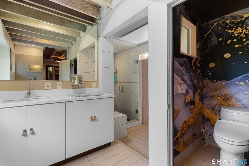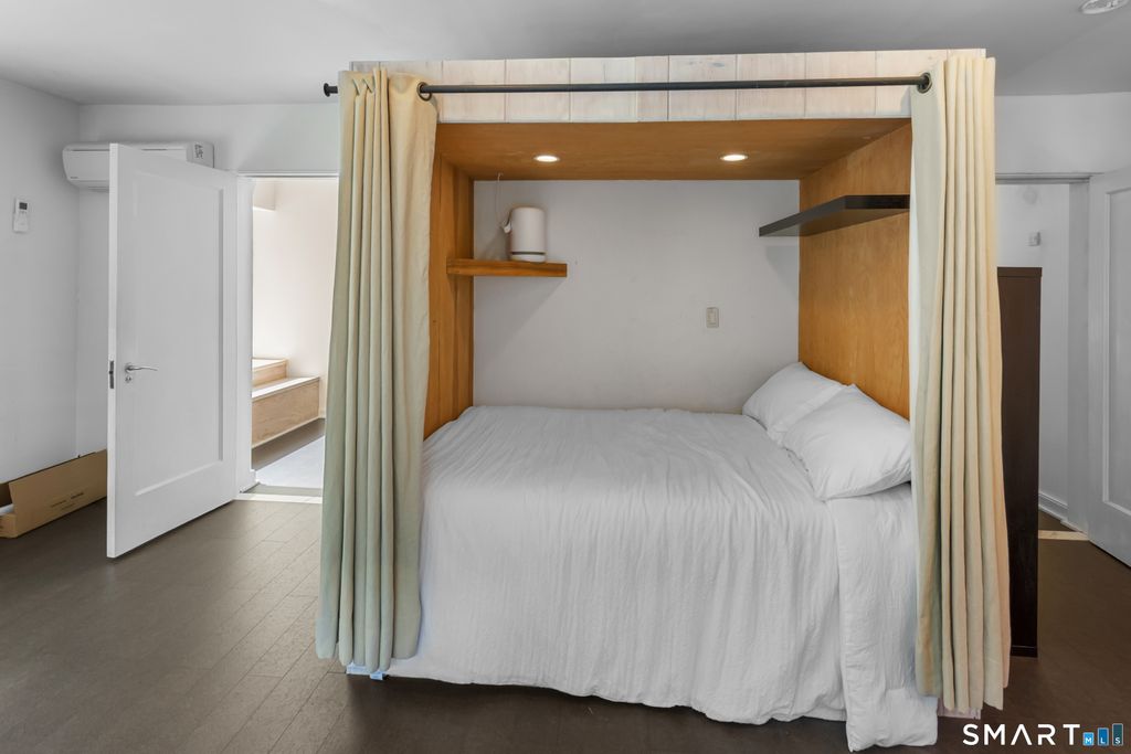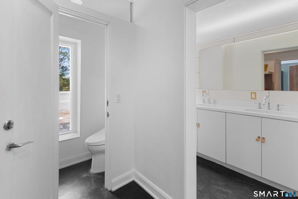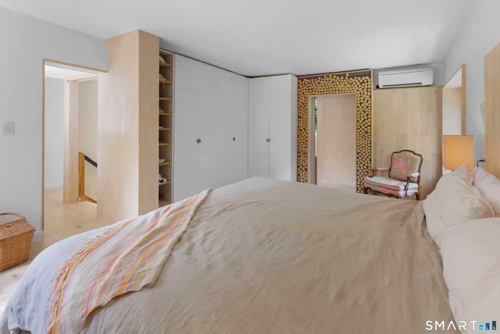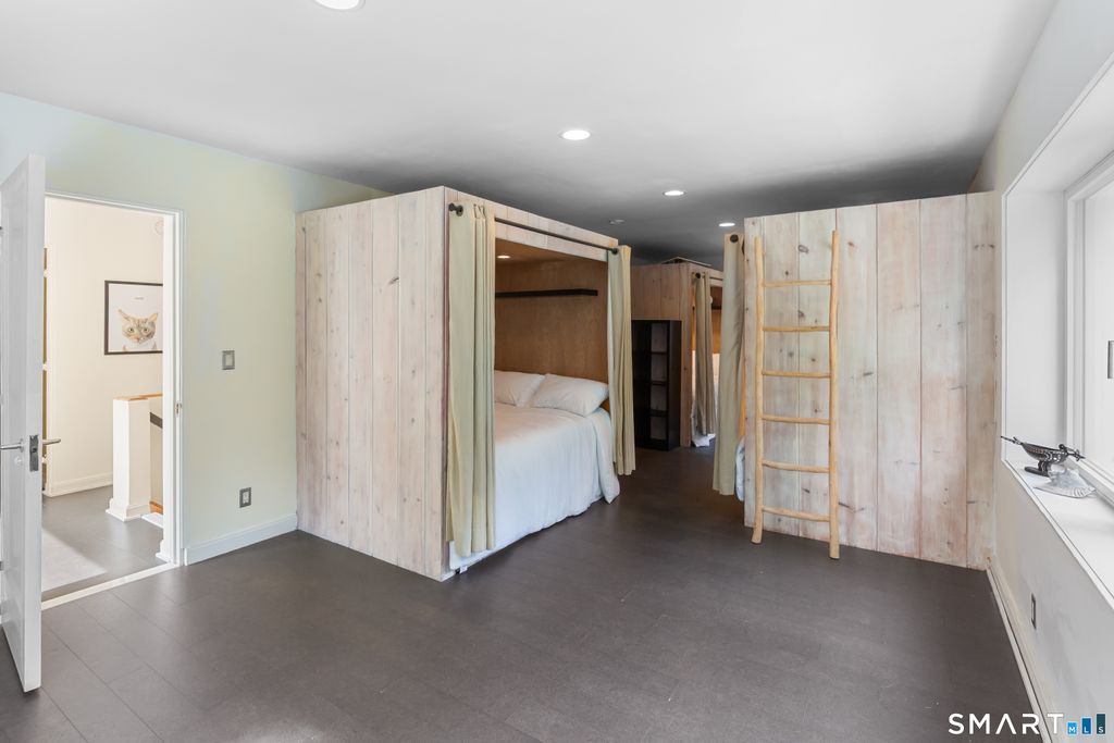 This Westport residence is a meticulously executed Passive House retrofit of a modernist concrete home originally built in 1938. Few properties achieve this level of energy efficiency while also prioritizing non-toxic, health-conscious building materials. As you pass through the home's front entry gate and hear the gentle rhythm of tires over gravel, a striking and handsome facade comes into view-an arrival that feels both intentional and memorable. The setting immediately conveys a sense of privacy, character, and architectural distinction. Your attention is naturally drawn to one of the most distinctive features of property: the Frazier Peters outbuilding. Rich in charm and architectural interest, this versatile structure offers exceptional flexibility-equally suited as a private office, creative studio, retreat, or state-of-the-art gaming lounge. The space adapts effortlessly to your vision and lifestyle Originally designed by Frank Lloyd Wright protege Francis Barry Byrne, the home is a masterwork of form, function, and sustainability. Proportioned according to the Golden Ratio and set high atop a hill, those who visit cannot help but to enjoy sweeping views of mature rhododendrons and stately oaks. Inside, limestone walls, clean architectural lines, and abundant natural light create an atmosphere that feels both striking and serene.