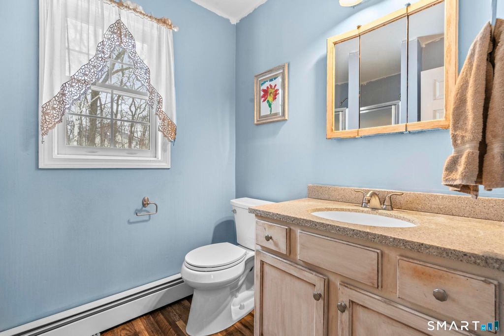 Welcome to 68 Doris Road, a beautifully maintained and thoughtfully updated home nestled in one of Bristol's most sought-after, family-friendly neighborhoods-Rockwood Estates. Set on a private .93-acre lot, this 3-bedroom, 2.5-bath home offers 1,744 square feet of living space plus an additional 600 square feet of finished lower-level space. From the moment you arrive, you'll appreciate the curb appeal, mature trees, and landscaped grounds, creating a serene, park-like setting. The expansive backyard is a true showstopper, featuring a sparkling pool and a stunning two-tiered deck designed for effortless entertaining and gatherings. This outdoor retreat offers rare privacy and generous space to relax or host. The main level boasts a spacious eat-in kitchen with updated appliances, a formal dining room, and a sun-filled front-to-back living room complete with a fireplace and hardwood floors throughout. A convenient half bath completes the first floor. Upstairs, you'll find three well-appointed bedrooms, including an expansive front-to-back primary suite with an ensuite bath and two walk-in closets. An additional full bath serves the remaining bedrooms. The finished lower level provides flexible living space ideal for a family room or home office. Additional highlights include central AC, baseboard heat, and wiring for a full-house generator, ensuring year-round comfort. Located near schools, parks, shopping, and major highways between New York and Boston, this home has it all!